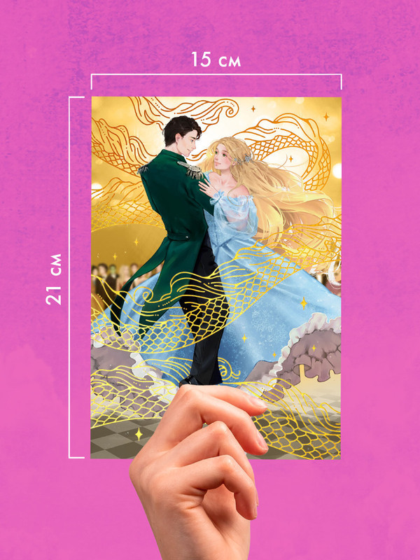 Чудесная иллюстрация Miorin к подарочному изданию романа изображает главных героев — Белль и принца Даррела — во время праздничного бала. Мерцающая фольга создает атмосферу романтической сказки о любви. На обороте открытки достаточно места, чтобы написать пожелания или признание.