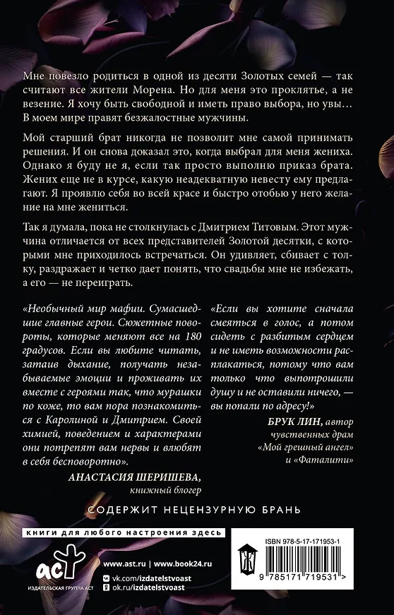 💳 Оплатить за товар можно при получении 🇰🇿 Есть бесплатная доставка по Казахстану 🎁 Копите бонусы с каждой покупки Серия: Опасные объятия Мне повезло родиться в одной из десяти Золотых семей — так считают все жители Морена. Но для меня это проклятье, а не везение. Я хочу быть свободной и иметь право выбора, но увы… В моем мире правят безжалостные мужчины. Мой старший брат никогда не позволит мне самой принимать решения. И он снова доказал это, когда выбрал для меня жениха. Однако я буду не я, если так просто выполню приказ брата. Жених еще не в курсе, какую неадекватную невесту ему предлагают. Я проявлю себя во всей красе и быстро отобью у него желание на мне жениться. |