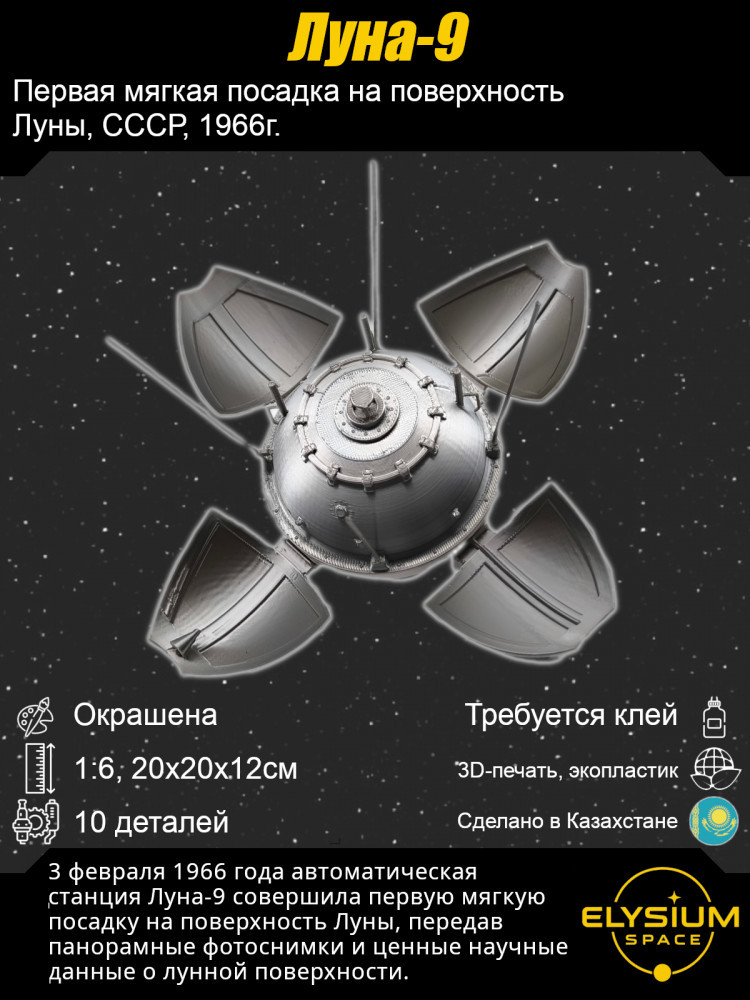 Сборная модель «Луна-9» — легендарный советский космический аппарат. В 1966 году «Луна-9» впервые в истории совершила мягкую посадку на поверхность Луны и передала снимки её ландшафта, открыв новую эру освоения космоса. Этот аппарат стал символом инженерного триумфа и научного прогресса.  |