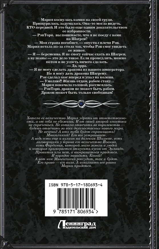 Твоё величество. Право кровиВ данный момент этот товар отсутствует в продаже. Возможно, у нас найдется аналогичный или похожий товар здесь. Серия: Другие миры Хотела ее величество Мария удрать от ответственности, а от себя не сбежишь. И от своей второй ипостаси не спрячешься. Не хотела отвечать за королевство — будешь отвечать за всех двуипостасных нового мира. Не хочешь? А кто тебя будет спрашивать? Многоликий? Его всё устраивает. А ведь есть еще и вулкан на далеком Шагрене, есть заговорщики у трона его величества Иоанна, есть Фардания, которой мало земель и людей и которая примеряется откусить кусок от Эрланда. Нравится или нет, а возвращаться придется. И порядок наводить. Какой? А вот как Многоликий рассудит, так и будет. Его право — его воля. А исполнять всё равно Марии придется. |