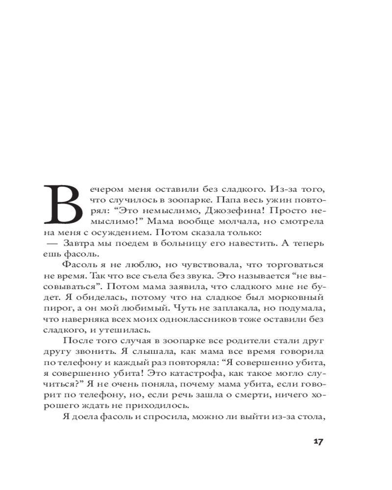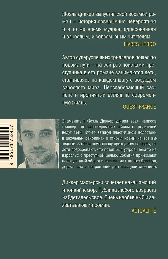 💳 Оплатить за товар можно при получении 🇰🇿 Есть бесплатная доставка по Казахстану 🎁 Копите бонусы с каждой покупки Серия: Весь Жоэль Диккер Катастрофа никогда не приходит одна. Ужасно катастрофическому походу школьников в зоопарк предшествовала целая серия катастроф, и первая из них — потоп в маленькой школе для особенных детей. Кто‑то залепил пластилином сливные отверстия в раковинах и открыл краны на все выходные. Школу закрывают, детей переводят в другую, соседнюю, но они не могут с этим смириться и тайно начинают собственное расследование. Они уверены, что потоп был устроен кем‑то из взрослых с преступной целью. Руководит расследованием девочка по имени Джозефина, она же и ведет рассказ: родители пригрозили оставить ее без сладкого, если она не выложит им всю правду. Однако события принимают неожиданный оборот и держат читателя в напряжении до последней страницы. |