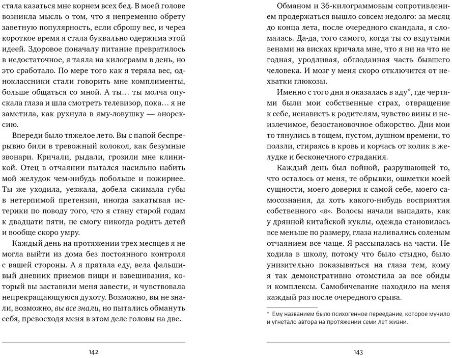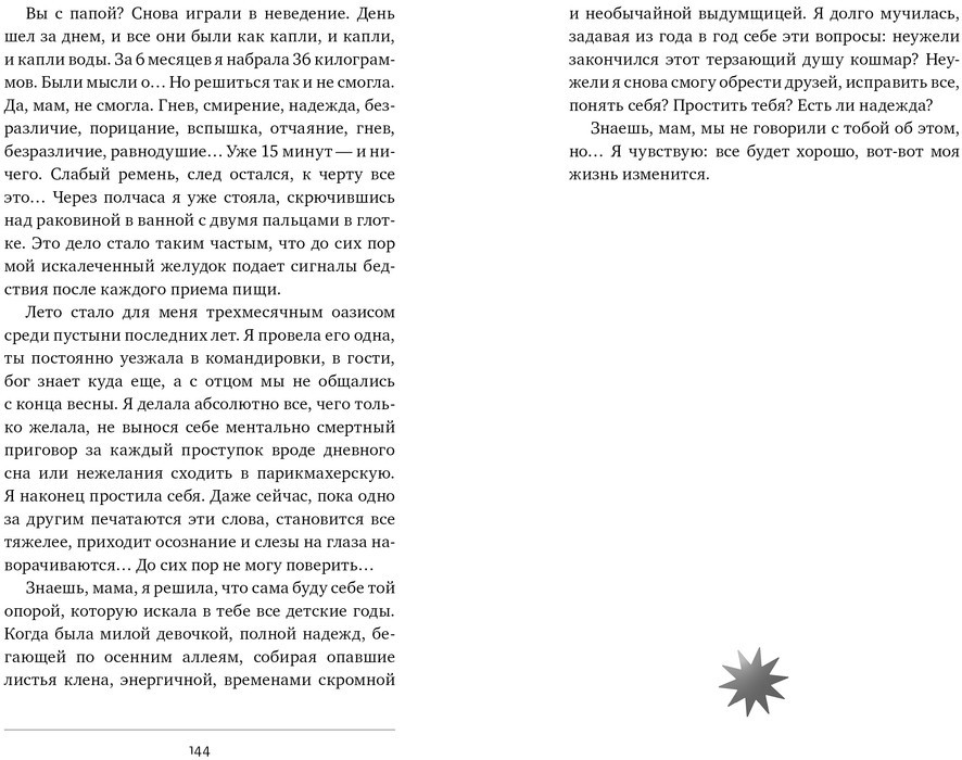 Серия: Clever Non-fiction Сборник «Мы не говорили об этом, мама» — это чтение, заставляющее задуматься о взаимоотношениях с главным человеком жизни. У каждого из нас есть переживания, нерешенные вопросы и просто острые темы, которые мы никогда не обсуждали с нашими мамами. Кому-то мешают страх, стыд или непонимание. Непроговоренные проблемы породили пропасть в общении с мамой, и нам кажется, мы уже не сможем ее преодолеть. В этом сборнике звучат истории из жизни, написанные от первого лица. Их авторы — самые обычные люди, которые решились проговорить то, что умалчивали со своими мамами годами. Их монологи — образец мужества и открытости. Непонимание, критика, зависть, домашнее насилие, селфхарм — лишь малая часть проблем, которые они озвучили. Их истории наполнены болью, любовью, злостью и прощением. |