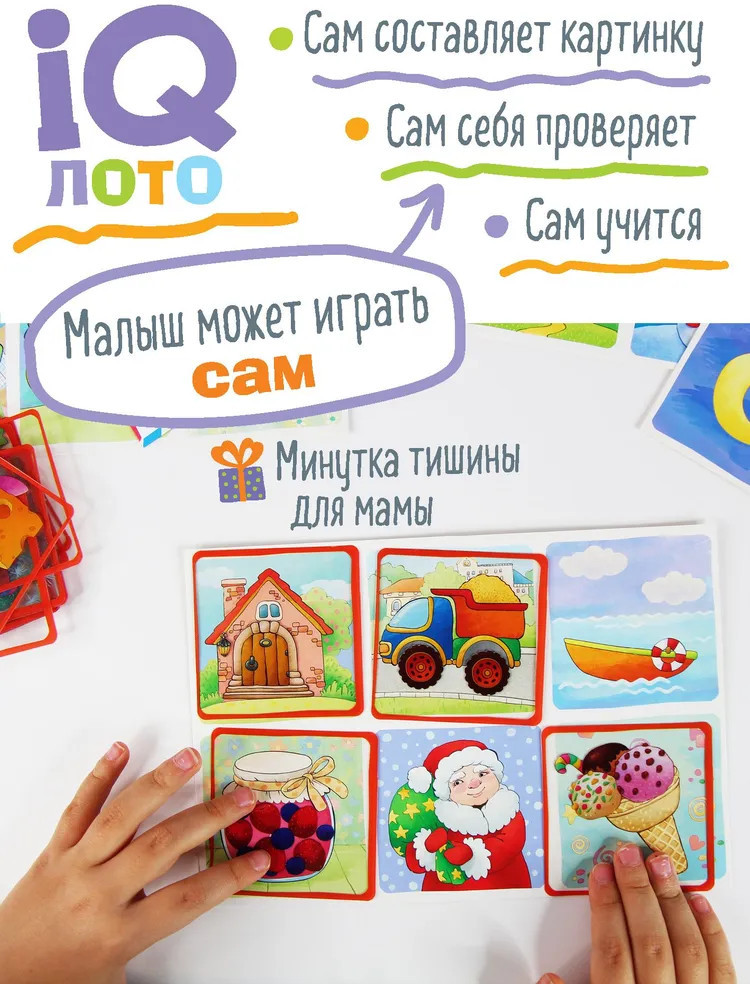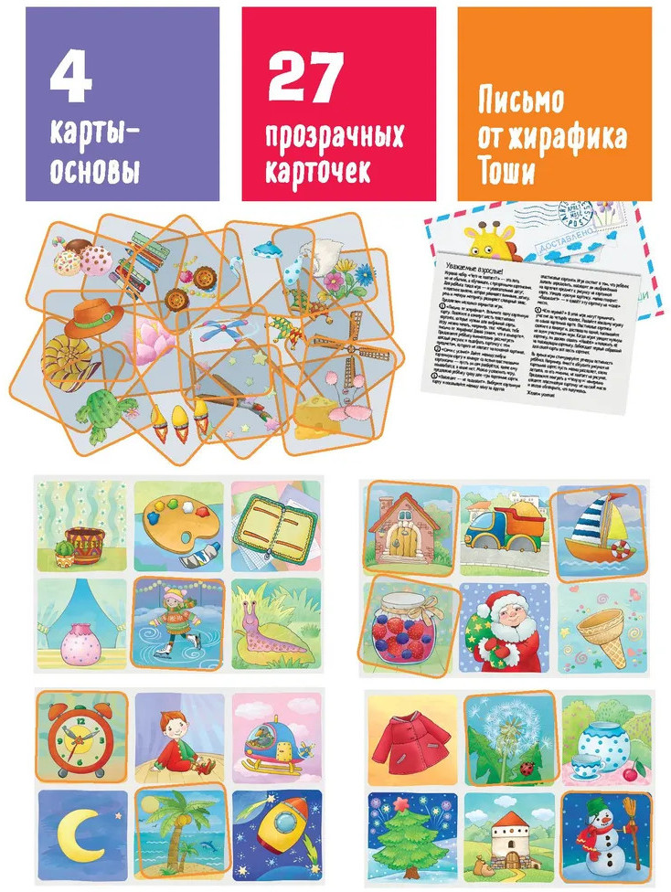 Лото «Что потерялось? Находим детали» — это обучающая игра для детей, начиная с 3 лет (хотя набор понравится и тем кому 4 или 5 лет). На картах-основах представлены рисунки, на которых не хватает отдельных деталей. Ребёнку предстоит внимательно рассмотреть каждую иллюстрацию, определить, чего на ней недостаёт, и подобрать карточку с подходящим рисунком. Прозрачные карточки позволяют малышу экспериментировать и самостоятельно искать решение. |