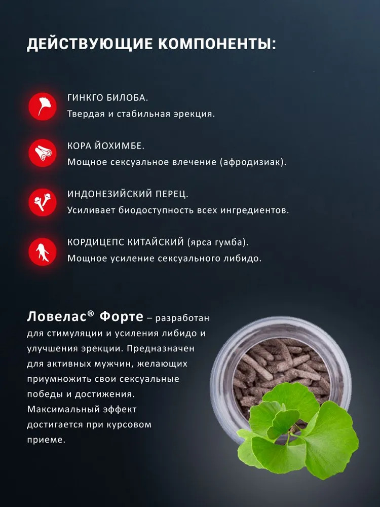 Биологически активная добавка к пище. Способствует улучшению потенции и повышению сексуальной активности. «Ловелас Форте» эффективен в течение 24 часов после приема. Не вызывает привыкания, не приводит к болезненной эрекции (приапизму). Рекомендован для ежедневного приема. «Ловелас Форте» — новая разработка для стимуляции и усиления либидо, и улучшения эрекции. Предназначен для активных мужчин, желающих приумножить свои сексуальные победы и достижения. Формула «Ловелас Форте» — составлена таким образом, чтобы входящие в её состав компоненты взаимно дополняли друг друга и оказывали максимальный эффект. Это позволит мужчине на протяжении длительного времени сохранять активное сексуальное желание и способность к его удовлетворению. Уникальная формула «Ловелас Форте» эффективно восстанавливает эректильную функцию, продлевает половой акт и усиливает сексуальную чувствительность. Действие «Ловелас Форте» активно поддерживает либидо и половое здоровье мужчины в течение суток на протяжении всего срока употребления. Максимальный эффект достигается при курсовом приеме. Сочетается с алкоголем в умеренных дозах и лекарственными средствами.
