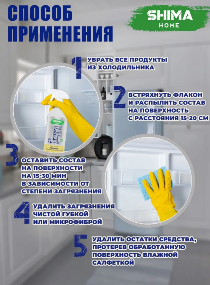 Перед применением необходимо удалить из холодильника все продукты и встряхнуть флакон. Для повседневной уборки средство наносят на губку или микрофибру, протирают поверхности и удаляют остатки влажной салфеткой. Для удаления стойких загрязнений очиститель распыляют на поверхность и оставляют на 15–30 минут для пролонгированного антимикробного действия, затем смывают остатки состава влажной губкой или микрофиброй.
