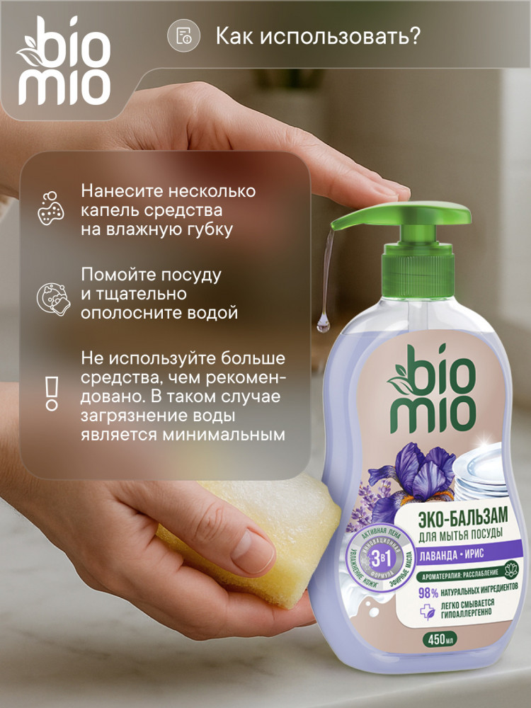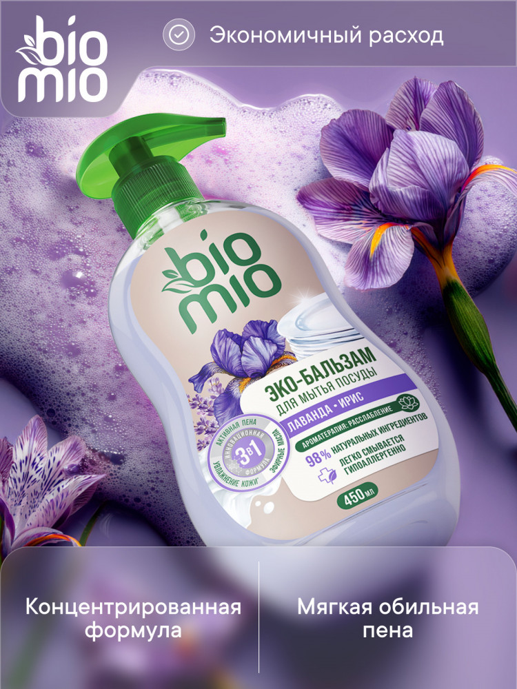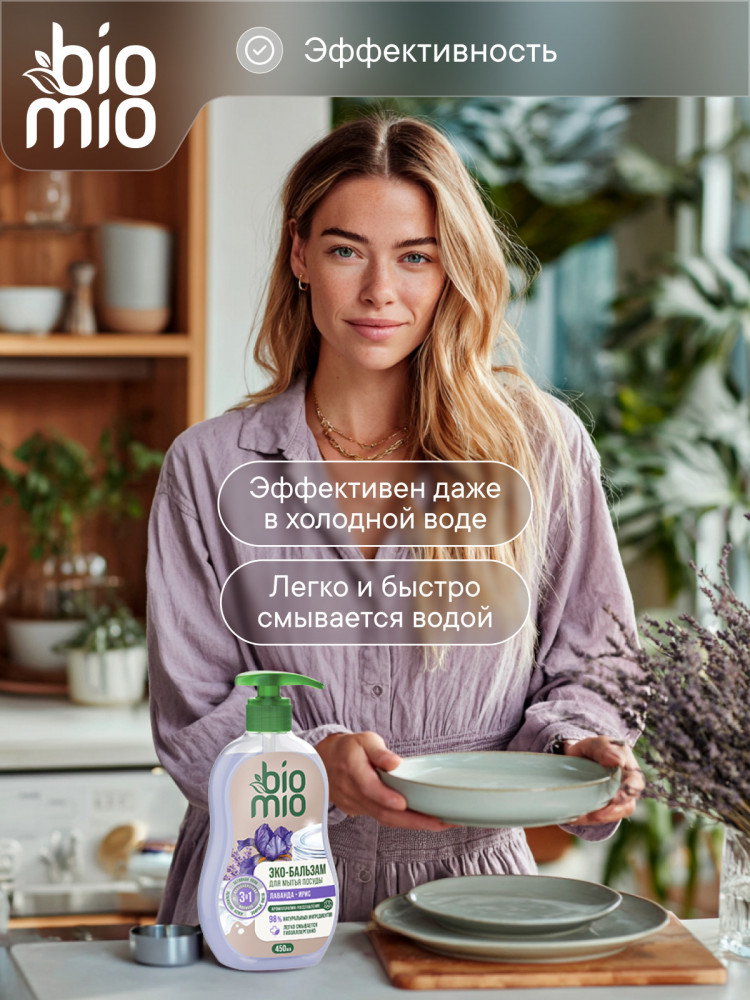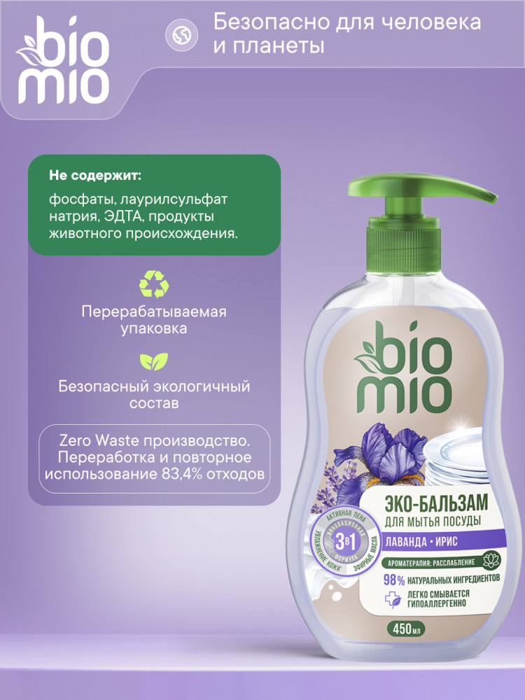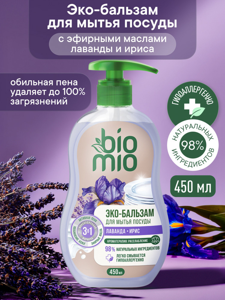 BioMio Экологичный бальзам для мытья взрослой и детской посуды с экстрактом хлопка и ионами серебра «Лаванда и Ирис»