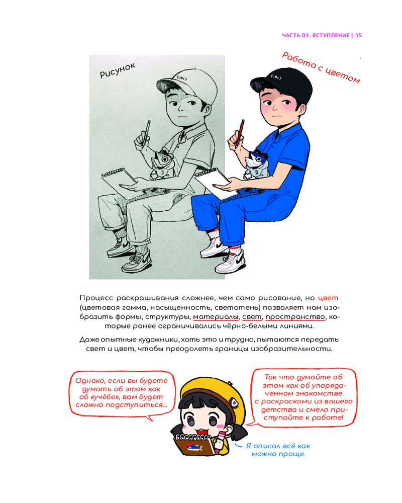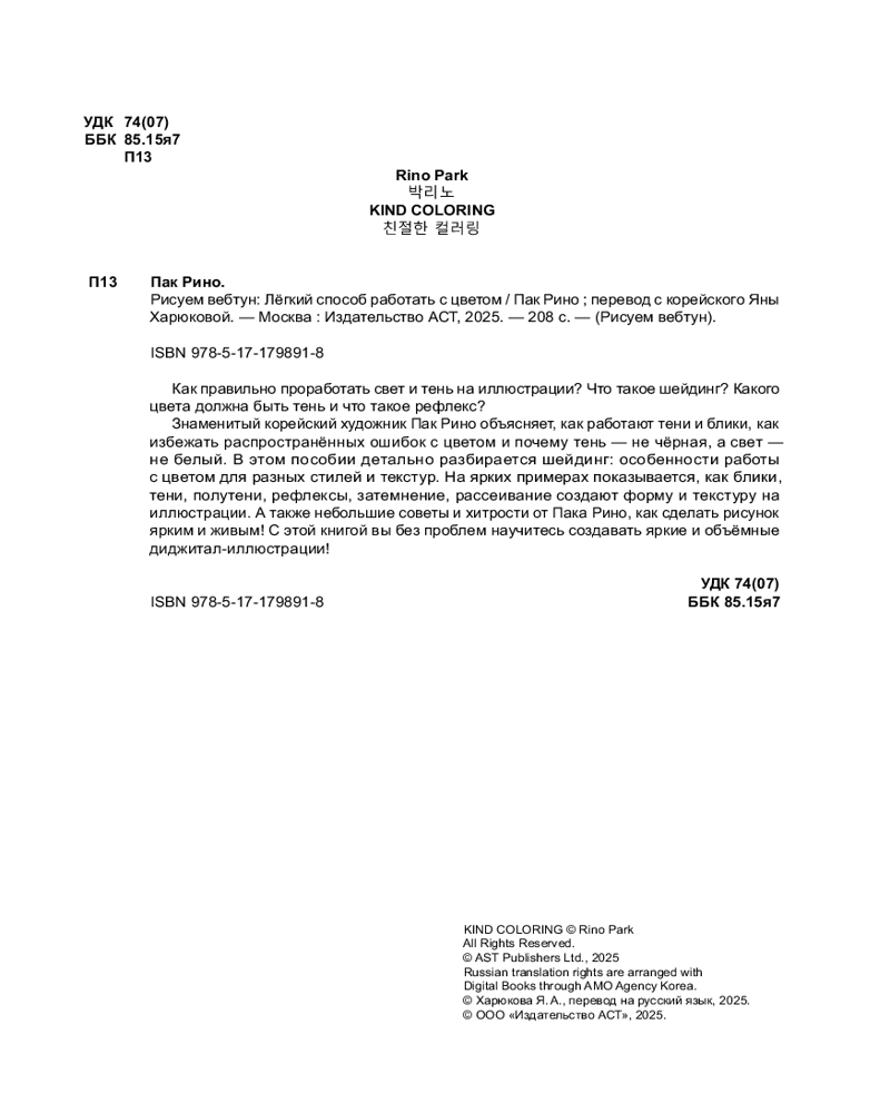💳 Оплатить за товар можно при получении 🇰🇿 Есть бесплатная доставка по Казахстану от 1 дня 🎁 Копите бонусы с каждой покупки Серия: Рисуем вебтун Как правильно проработать свет и тень на иллюстрации? Что такое шейдинг? Какого цвета должна быть тень и что такое рефлекс? Знаменитый корейский художник Пак Рино объясняет, как работают тени и блики, как избежать распространённых ошибок с цветом и почему тень — не чёрная, а свет — не белый. В этом пособии детально разбирается шейдинг: особенности работы с цветом для разных стилей и текстур. На ярких примерах показывается, как блики, тени, полутени, рефлексы, затемнение, рассеивание создают форму и текстуру на иллюстрации. А также небольшие советы и хитрости от Пака Рино, как сделать рисунок ярким и живым! С этой книгой вы без проблем научитесь создавать яркие и объёмные диджитал-иллюстрации! |