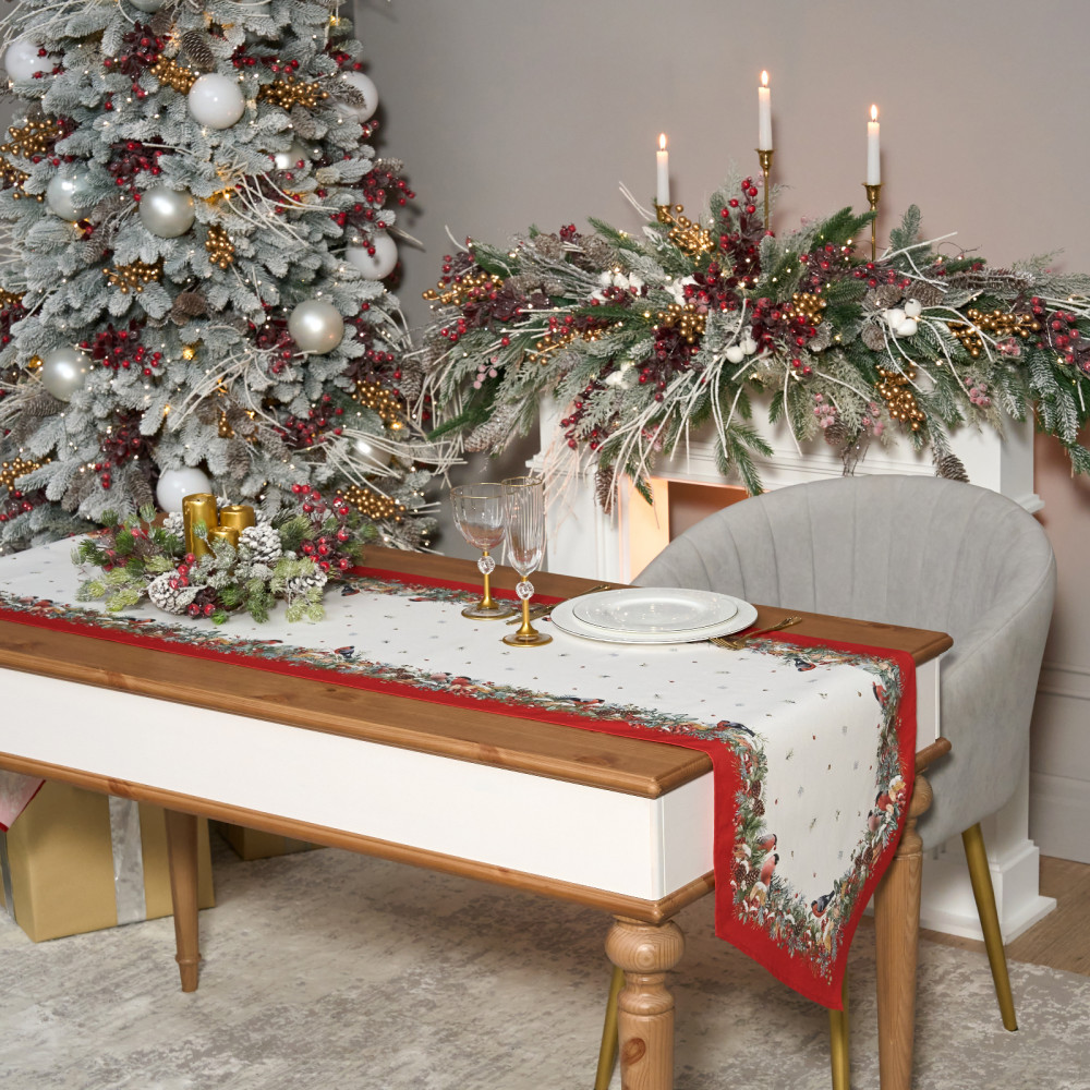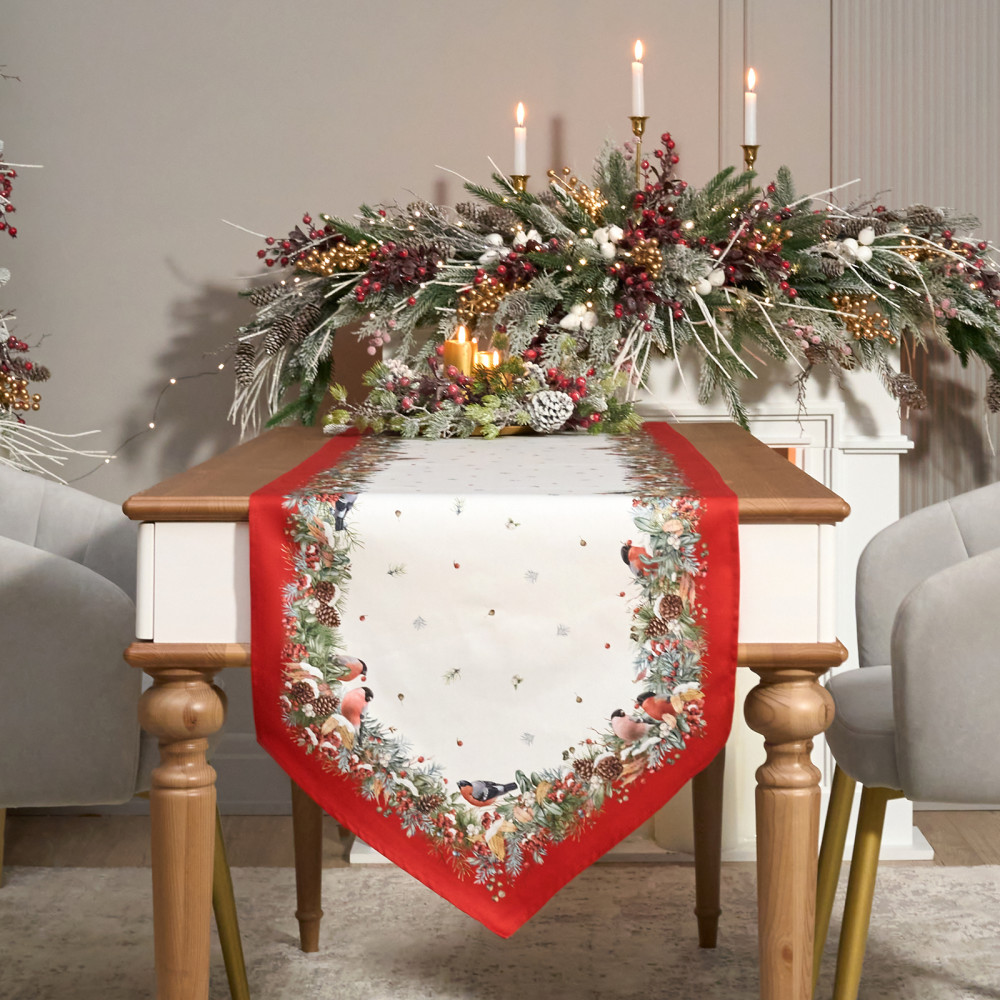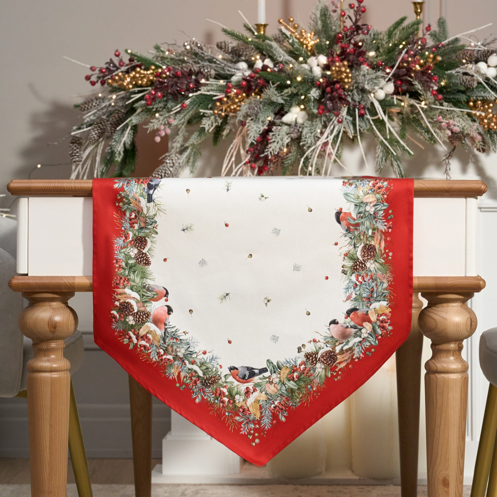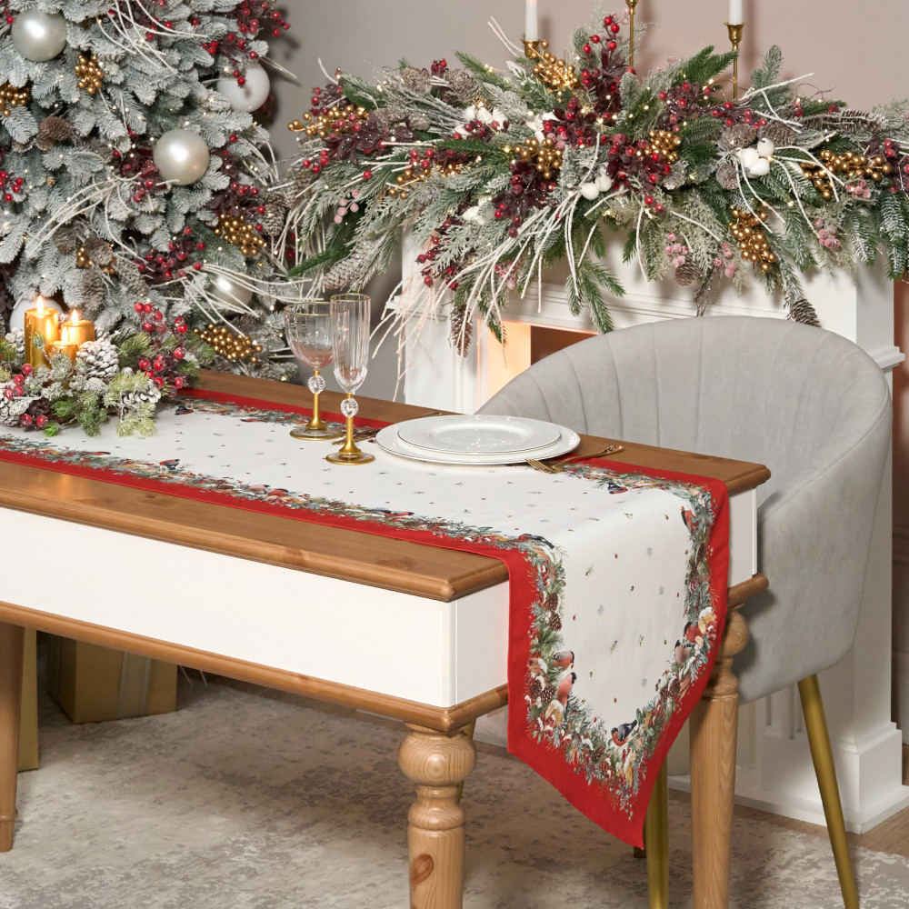 Принт выполнен в технике цифровой печати: по краям композиция из снегирей, еловых ветвей, шишек, заснеженных листьев и красных ягод на светлом фоне с насыщенной красной каймой. Цвета остаются яркими даже после многократных стирок. Оформление симметрично по краям, благодаря чему дорожка эффектно смотрится на столе. Хорошо комбинируется с однотонными скатертями, посудой в классическом или прованском стиле, текстилем в зимней палитре. Подходит для дома, дачи, загородного коттеджа. Размер 45×300 см идеально подойдёт для прямоугольных и овальных столов, позволяя создать аккуратный и завершённый образ сервировки. Скатерть-дорожка Lefard — это не просто декор, а знак внимания и заботы. Она станет тёплым и практичным подарком для мамы, бабушки или любимой женщины, добавив уюта и праздничного настроения в дом.