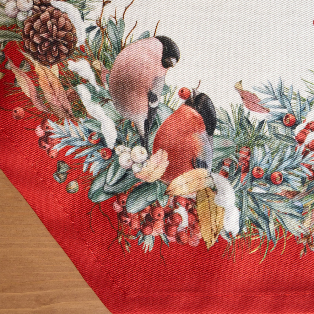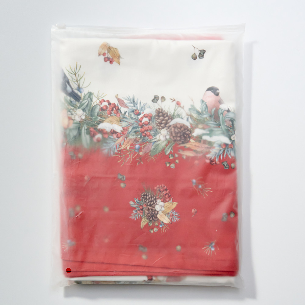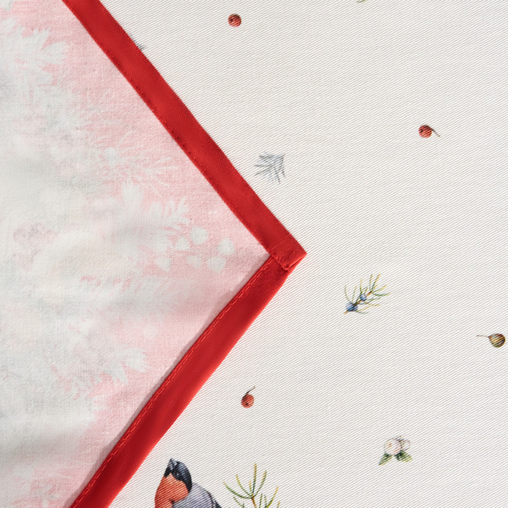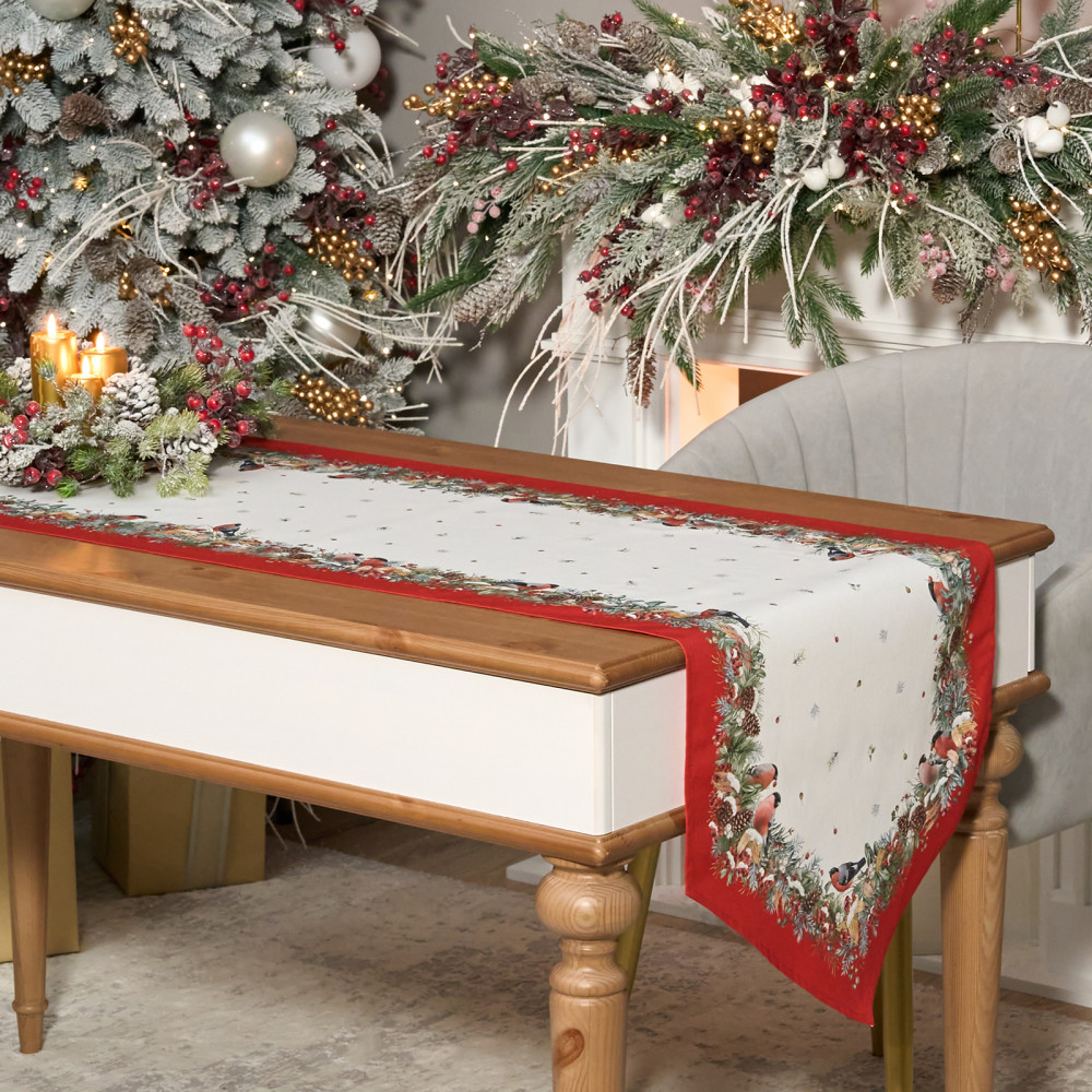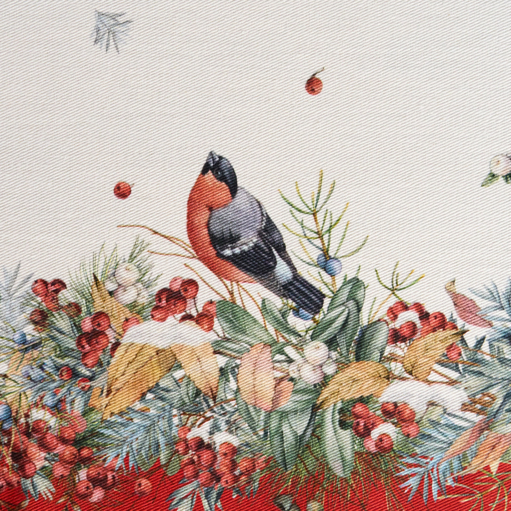 Принт выполнен в технике цифровой печати: по краям композиция из снегирей, еловых ветвей, шишек, заснеженных листьев и красных ягод на светлом фоне с насыщенной красной каймой. Цвета остаются яркими даже после многократных стирок. Оформление симметрично по краям, благодаря чему дорожка эффектно смотрится на столе. Хорошо комбинируется с однотонными скатертями, посудой в классическом или прованском стиле, текстилем в зимней палитре. Подходит для дома, дачи, загородного коттеджа. Размер 45×300 см идеально подойдёт для прямоугольных и овальных столов, позволяя создать аккуратный и завершённый образ сервировки. Скатерть-дорожка Lefard — это не просто декор, а знак внимания и заботы. Она станет тёплым и практичным подарком для мамы, бабушки или любимой женщины, добавив уюта и праздничного настроения в дом.