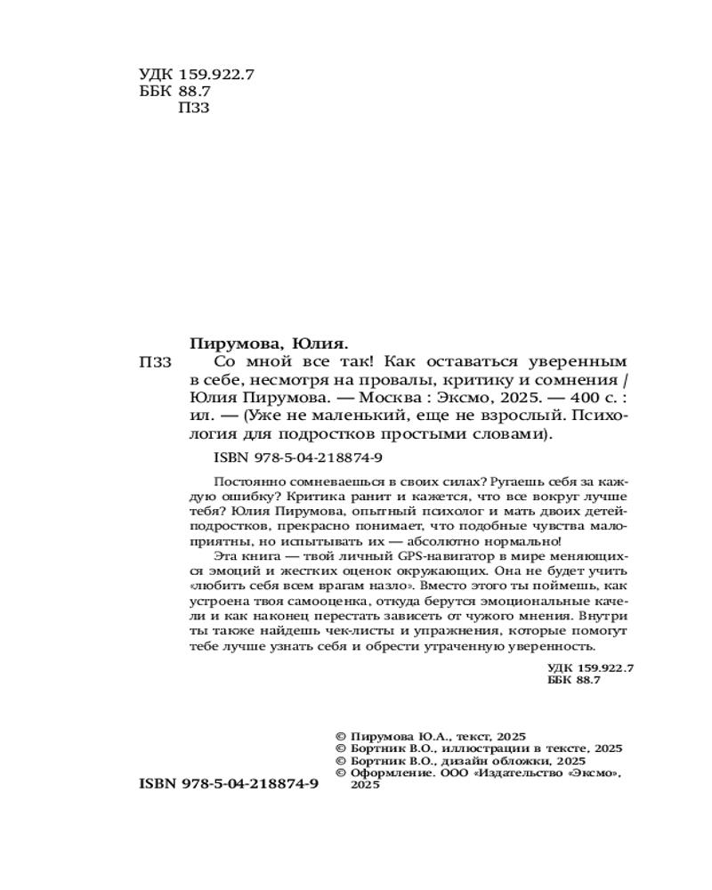 💳 Оплатить за товар можно при получении 🇰🇿 Есть бесплатная доставка по Казахстану 🎁 Копите бонусы с каждой покупки Серия: Уже не ребенок, еще не взрослый. Психология для подростков простыми словами Постоянно сомневаешься в своих силах? Ругаешь себя за каждую ошибку? Критика ранит, и кажется, что все вокруг лучше тебя? Юлия Пирумова, опытный психолог и мать двоих детей-подростков, прекрасно понимает, что подобные чувства малоприятны, но испытывать их — абсолютно нормально! |