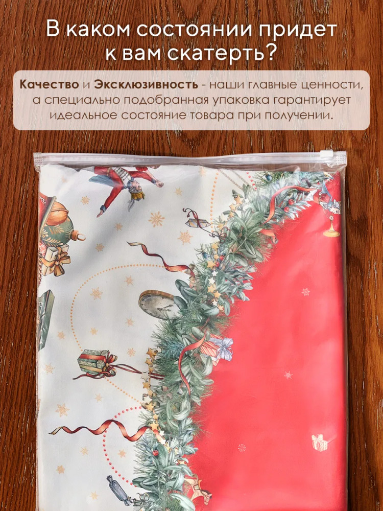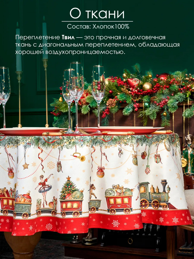 Овальная скатерть создана производителем по эксклюзивному дизайну для серии посуды «Щелкунчик» бренда Lefard. Прекрасно подойдет для любого стола. Изготовлена из плотного хлопкового текстиля с пропиткой, за счёт которой с неё легко убрать пролитую жидкость. Плотность ткани составляет 190 г\м2, она имеет приятную структуру и называется твил. Состав ткани 100% хлопок с водоотталкивающей пропиткой. Наша водонепроницаемая скатерть легка в уходе, она не впитывает мгновенно жидкость на обеденном столе и избавит вас от хлопот с отстирыванием пятен после застолья. Ее можно стирать и при этом она не теряет свою текстуру и цвет даже после многих стирок. Главными преимуществами твила являются износостойкость, плотность и лёгкий красивый блеск. Эта ткань не заламывается и не сильно мнется. Скатерть из твила выглядит аккуратно и элегантно. Производство находится в России, мы относимся с любовью к каждому товару, ровные и аккуратные швы порадуют Вас. Мы рады производить текстиль высокого качества. Такая скатерть станет отличным дополнением к интерьеру вашей кухни.