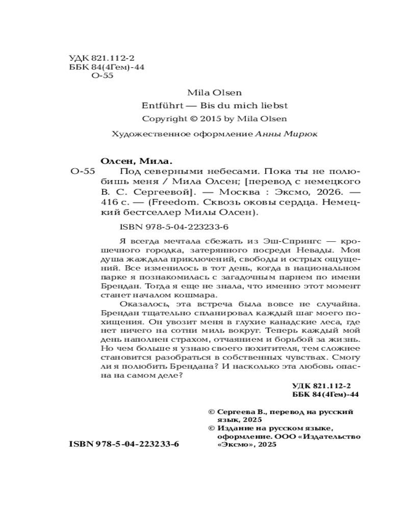 💳 Оплатить за товар можно при получении 🇰🇿 Есть бесплатная доставка по Казахстану 🎁 Копите бонусы с каждой покупки Серия: Freedom. Сквозь оковы сердца. Немецкий бестселлер Милы Олсен Я всегда мечтала сбежать из Эш-Спрингс — крошечного городка, затерянного посреди Невады. Моя душа жаждала приключений, свободы и острых ощущений. Всё изменилось в тот день, когда в национальном парке я познакомилась с загадочным парнем по имени Брендан. Тогда я еще не знала, что именно этот момент станет началом кошмара. |
