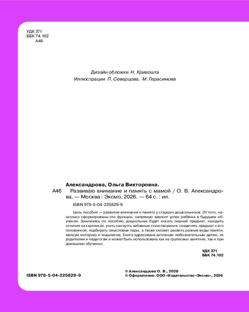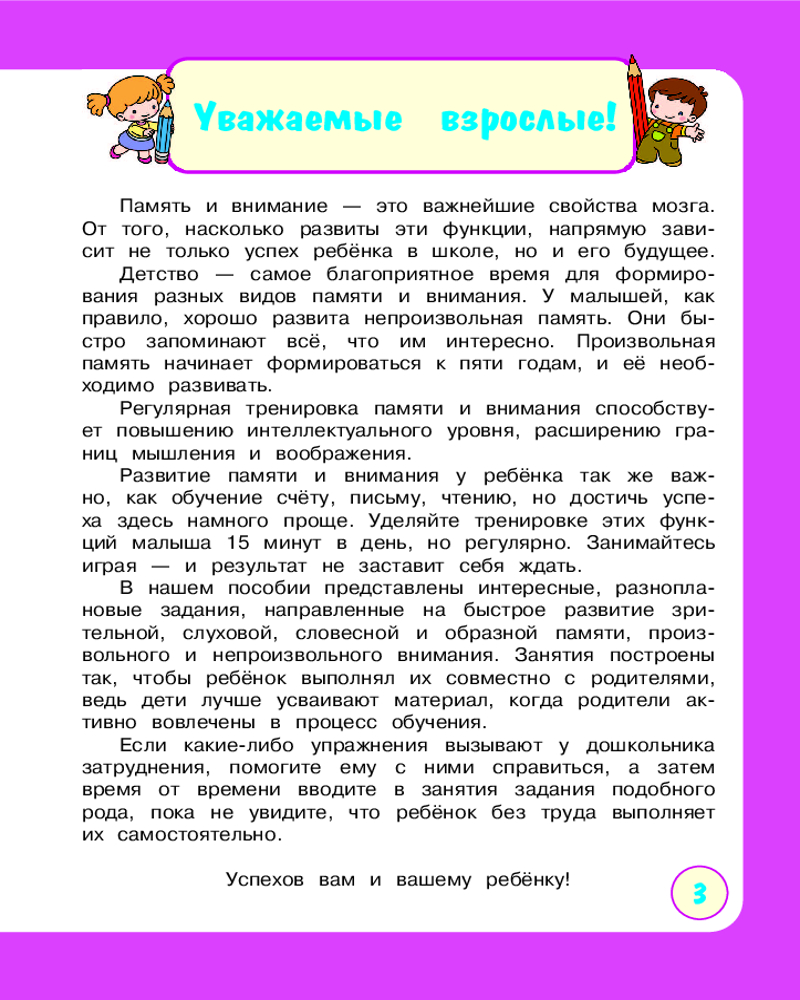 💳 Оплатить за товар можно при получении 🇰🇿 Есть бесплатная доставка по Казахстану от 1 дня 🎁 Копите бонусы с каждой покупки Серия: Учимся с мамой Развитие внимания и памяти — важная часть подготовки к будущему обучению, и развивать их нужно как можно раньше. В нашем пособии мальчики и девочки найдут разноплановые игровые задания, направленные на быстрое усовершенствование этих функций, а также тренировку мышления и речи. Занимаясь, ребенок будет находить отличия на картинках, учить наизусть забавные стихотворения, искать лишний предмет, определять, какая часть подходит к целому изображению, соединять предметы с их тенью, подбирать смысловые пары. Вместе с этим пособием каждое занятие превратится в интересное приключение, и ребёнок не заметит, как пролетит время. Книга-развивашка, предназначенная для совместных занятий мамы и ребёнка, станет надежным помощником в процессе подготовки к школе. Простые задания легко выполнять дома, на прогулке или в дороге. Обучение, проходящее в виде веселой увлекательной игры, поможет ребенку не только развить ключевые навыки, но и почувствовать уверенность в своих силах. |