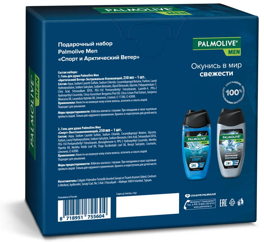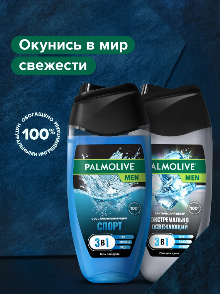 Гель для душа Palmolive Men «Арктический Ветер»: Aqua, Sodium Laureth Sulfate, Sodium Chloride, Cocamidopropyl Betaine, Parfum, Lauryl Hydroxysultaine, Sodium Salicylate, Sodium Benzoate, Glycol Distearate, Glycerin, Polyquaternium-7, Citric Acid, Tetrasodium EDTA, PEG-150 Pentaerythrityl Tetrastearate, Laureth-4, PPG-2 Hydroxyethyl Cocamide, Citrus Aurantium Bergamia Peel Oil, Citrus Limon Peel Extract, Juniperus Mexicana Oil, Lavandula Hybrida Oil, Limonene, Linalool, CI 17200, CI 42090.