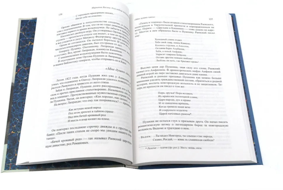 Это были и тяжелые, и необычайно плодотворные годы: жизнь в Кишиневе под дружественным надзором наместника Бессарабии генерала И.Н. Инзова, дружба с генералом-вольнодумцем М. Ф. Орловым, знакомство с южными декабристами, путешествие с семьей знаменитого генерала Н.Н. Раевского в Крым, на Кавказ и в Грузию, несколько дуэлей, к счастью окончившихся бескровно. Затем перевод в Одессу, влюбленность в красавицу графиню Е.К. Воронцову и тяжелый конфликт с ее мужем, наместником Новороссии графом М.С. Воронцовым... Яркая, пестрая, увлекательная картина... И главное — творчество: южные поэмы, первые главы «Евгения Онегина», работа над «Цыганами» и многое, много другое. И внезапный драматический финал — донос и новая ссылка в глухое псковское имение Михайловское. |