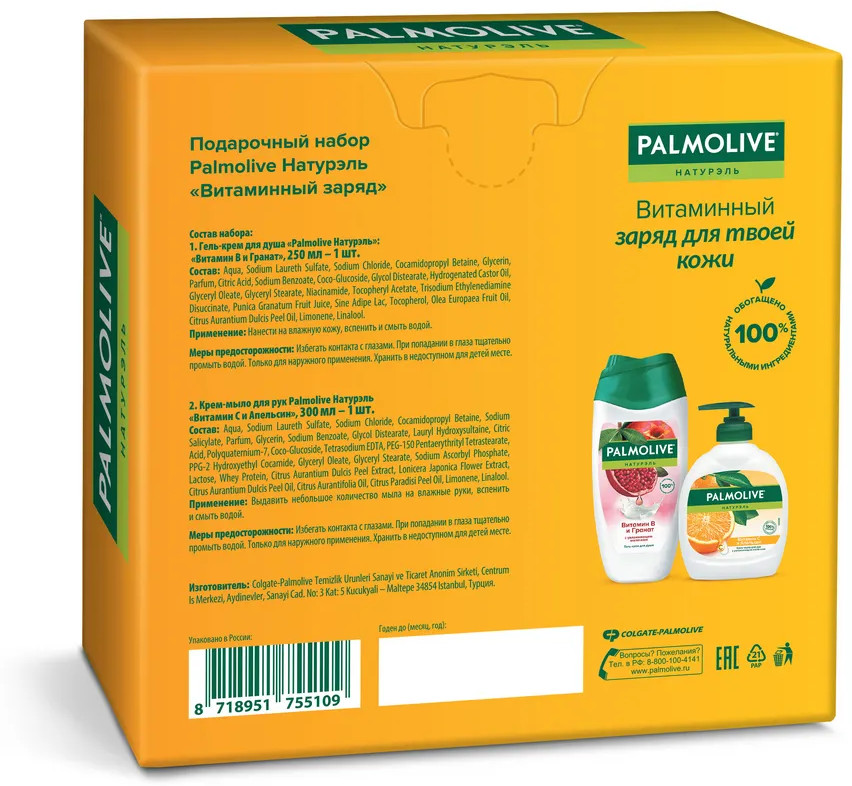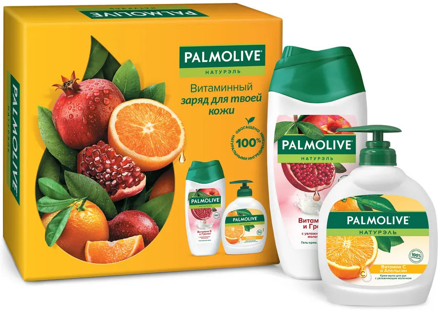 Гель-крем для душа «Palmolive Натурэль»: «Витамин В и гранат», 250 мл: Aqua, Sodium Laureth Sulfate, Sodium Chloride, Cocamidopropyl Betaine, Glycerin, Parfum, Citric Acid, Sodium Benzoate, Coco-Glucoside, Glycol Distearate, Hydrogenated Castor Oil, Glyceryl Oleate, Glyceryl Stearate, Niacinamide, Tocopheryl Acetate, Trisodium Ethylenediamine Disuccinate, Punica Granatum Fruit Juice, Sine Adipe Lac, Tocopherol, Olea Europaea Fruit Oil, Citrus Aurantium Dulcis Peel Oil, Limonene, Linalool.