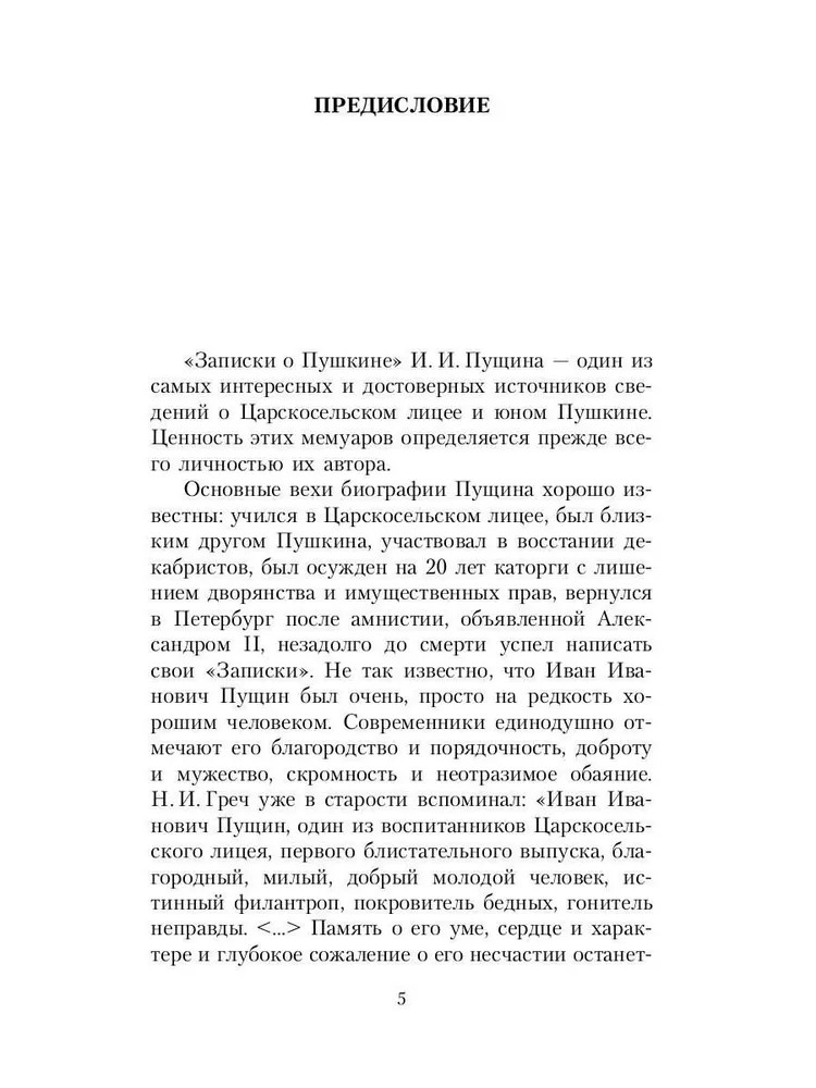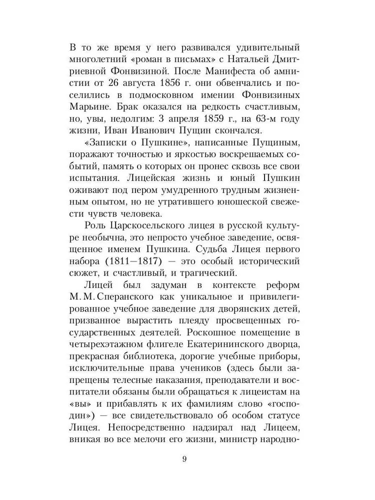 Записки о ПушкинеВ данный момент этот товар отсутствует в продаже. Возможно, у нас найдется аналогичный или похожий товар здесь. Серия: Воспоминания о писателях «Записки о Пушкине» — трогательное, обстоятельное и честное свидетельство человека, который знал поэта не только как гения, но и как друга. Иван Иванович Пущин — лицейский товарищ и верный спутник Пушкина — собирает живые зарисовки лицейской поры, московских и петербургских салонов, тихих вечеров в Михайловском и времени тягостных разлук. Перед читателем предстает уникальный, лишенный последующей мифологизации портрет юного Пушкина — остроумного, пылкого, ранимого. Особую глубину «Запискам...» придает драматичный контраст между описываемой беззаботной юностью и тем, что эти воспоминания создавались Пущиным в годы изгнания, в сибирской ссылке — уже после трагической гибели поэта. |