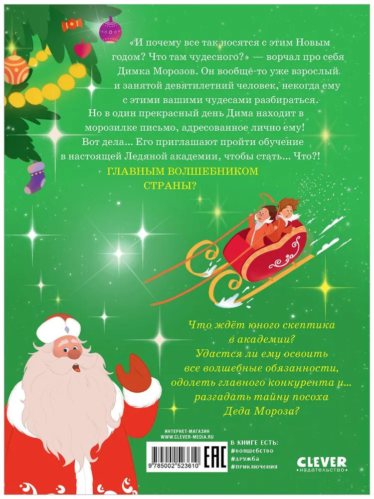 💳 Оплатить за товар можно при получении 🇰🇿 Есть бесплатная доставка по Казахстану 🎁 Копите бонусы с каждой покупки «И почему все так носятся с этим Новым годом? Что там чудесного?» — ворчал про себя Димка Морозов. Он вообще‑то уже взрослый и занятой девятилетний человек, некогда ему с этими вашими чудесами разбираться. Но в один прекрасный день Дима находит в морозилке письмо, адресованное лично ему! Вот дела... Его приглашают пройти обучение в настоящей Ледяной академии, чтобы стать... Что?! ГЛАВНЫМ ВОЛШЕБНИКОМ СТРАНЫ? Что ждёт юного скептика в академии? Удастся ли ему освоить все волшебные обязанности, одолеть главного конкурента и... разгадать тайну посоха Деда Мороза? |