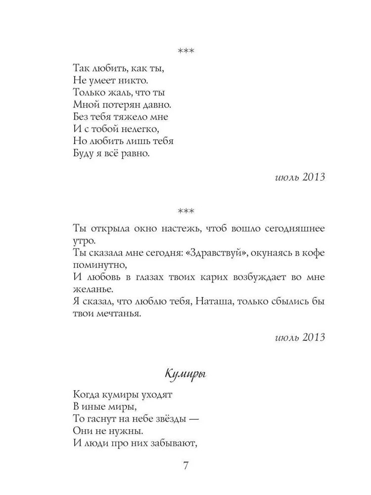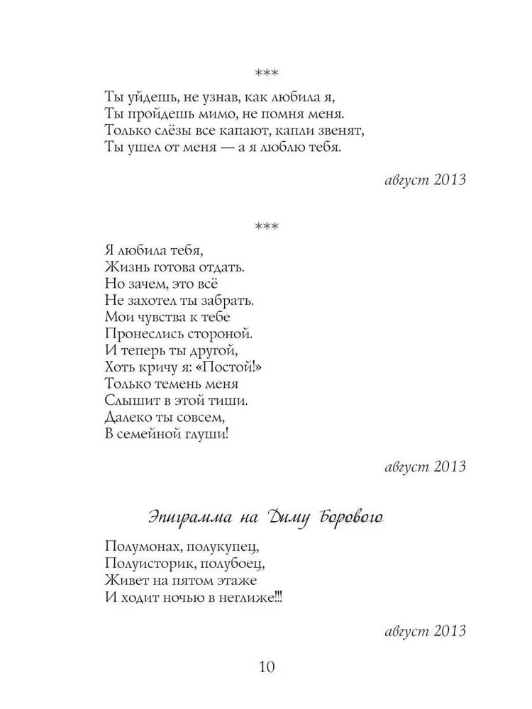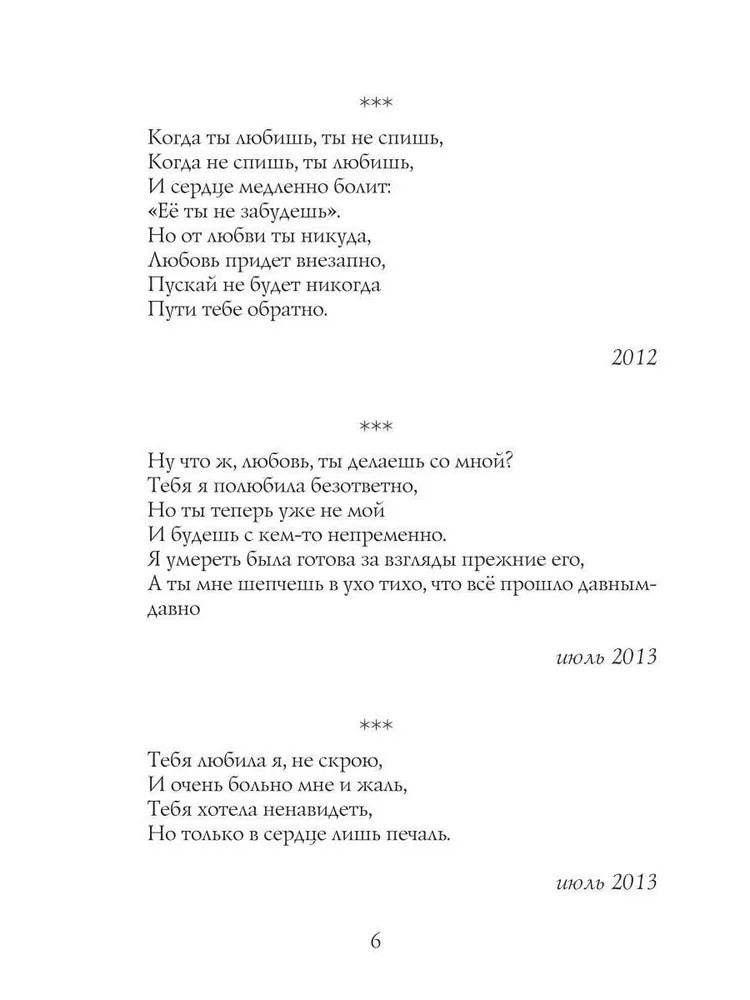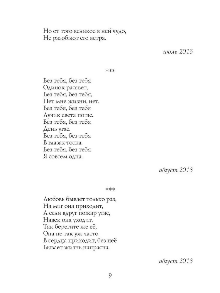 Серия: Современная поэзия Эта книга — искренняя исповедь, где каждая строчка становится отражением прожитых мгновений, больших и малых событий, сокровенных мыслей и чувств. В книге «Моя жизнь в стихах» автор делится с читателем самым личным: радостями и потерями, любовью и одиночеством, сомнениями и надеждами. Стихи написаны от души, они короткие и содержат много чувств и эмоций в двух-трёх строчках. Так же стихи расположены по порядку их написания, поэтому очень интересно наблюдать за изменениями стихотворений. Можно проследить как менялось мировоззрение и творчество поэта в процессе жизни. |