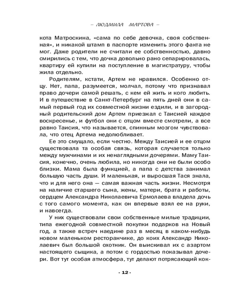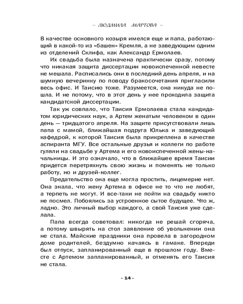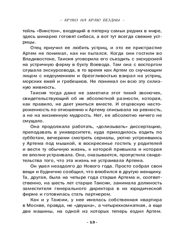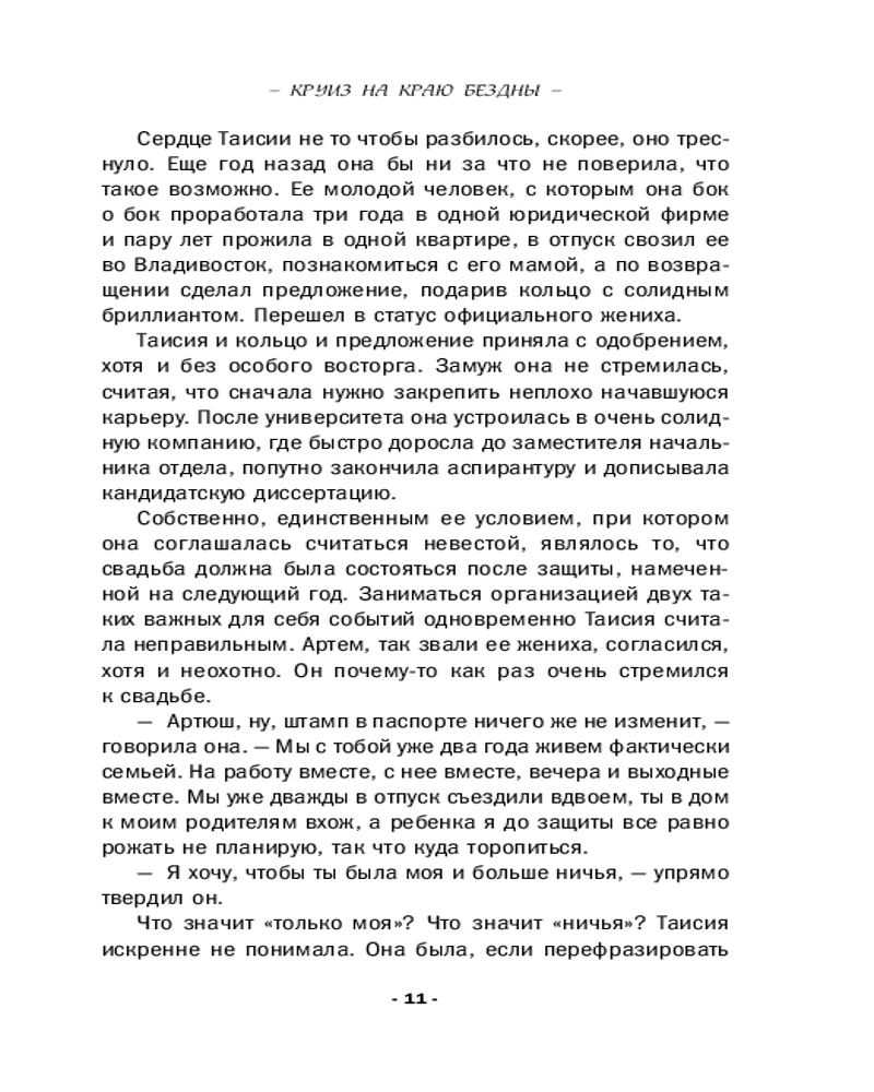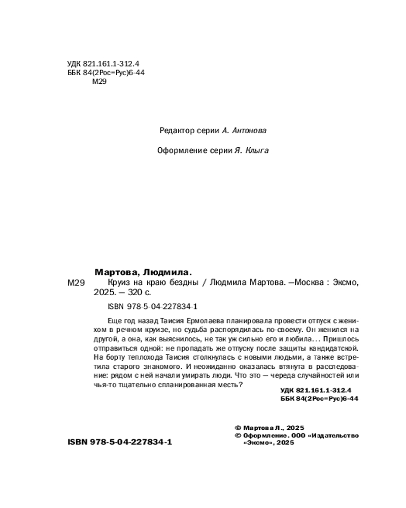 💳 Оплатить за товар можно при получении 🇰🇿 Есть бесплатная доставка по Казахстану от 1 дня 🎁 Копите бонусы с каждой покупки Серия: Желание женщины. Детективные романы Л. Мартовой. Новое оформление Еще год назад Таисия Ермолаева планировала провести отпуск с женихом в речном круизе, но судьба распорядилась по-своему. Он женился на другой, а она, как выяснилось, не так уж сильно его и любила... Пришлось отправиться одной: не пропадать же отпуску после защиты кандидатской. На борту теплохода Таисия столкнулась с новыми людьми, а также встретила старого знакомого. И неожиданно оказалась втянута в расследование: рядом с ней начали умирать люди. Что это — череда случайностей или чья-то тщательно спланированная месть? |