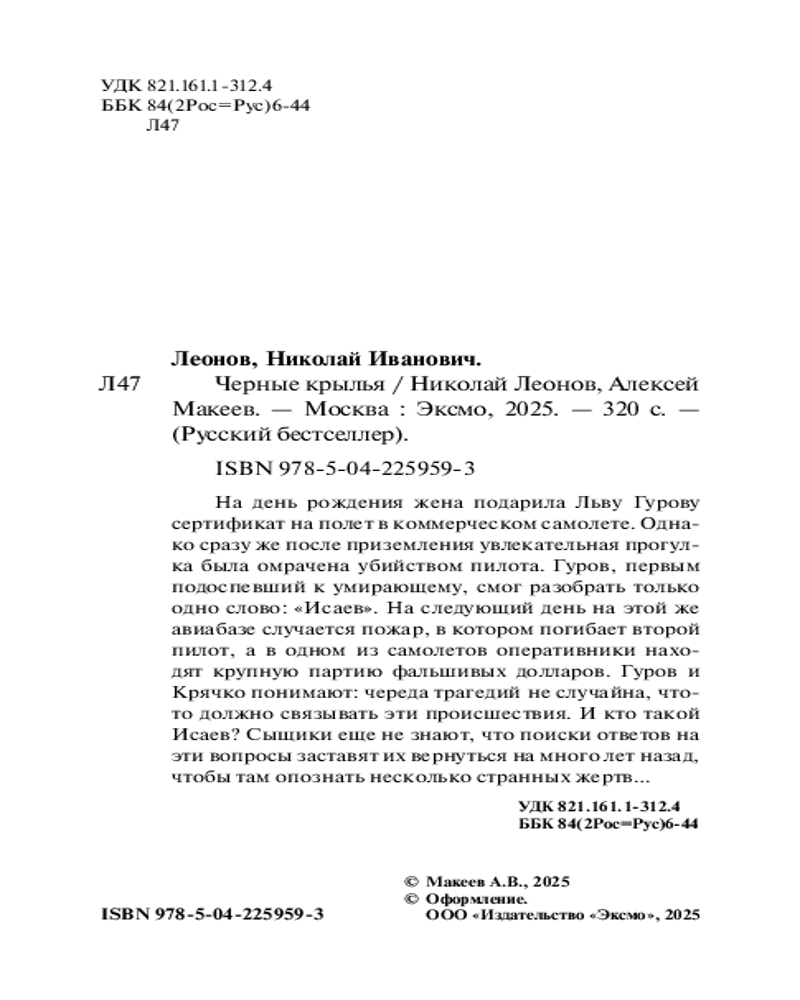 💳 Оплатить за товар можно при получении 🇰🇿 Есть бесплатная доставка по Казахстану 🎁 Копите бонусы с каждой покупки Серия: Русский бестселлер (обложка) На день рождения жена подарила Льву Гурову сертификат на полет в коммерческом самолете. Однако сразу же после приземления увлекательная прогулка была омрачена убийством пилота. Гуров, первым подоспевший к умирающему, смог разобрать только одно слово: «Исаев». На следующий день на этой же авиабазе случается пожар, в котором погибает второй пилот, а в одном из самолетов оперативники находят крупную партию фальшивых долларов. Гуров и Крячко понимают: череда трагедий не случайна, что-то должно связывать эти происшествия. И кто такой Исаев? Сыщики еще не знают, что поиски ответов на эти вопросы заставят их вернуться на много лет назад, чтобы там опознать несколько странных жертв... |