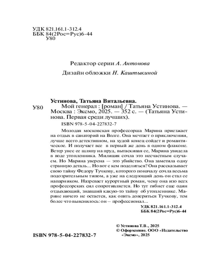 💳 Оплатить за товар можно при получении 🇰🇿 Есть бесплатная доставка по Казахстану от 1 дня 🎁 Копите бонусы с каждой покупки Серия: Татьяна Устинова. Первая среди лучших (обложка) Молодая московская профессорша Марина приезжает на отдых в санаторий на Волге. Она мечтает о приключении, лучше всего детективном, на худой конец сойдет и романтическое. И получает все в первый же день в одном флаконе. Ветер унес ее шляпу на пруд, вытаскивая ее, Марина увидела в воде утопленника. Милиция сочла это несчастным случаем. Но Марина уверена — это убийство. Она заметила одну странную деталь... Но вот с кем поделиться? Она рассказывает свою тайну Федору Тучкову, которого поначалу сочла весьма подозрительным типом, а уже на следующий день он стал ее напарником. Назревает курортный роман, чему она изо всех профессорских сил сопротивляется. Но тут гибнет еще один отдыхающий, знавший какую-то тайну об утопленнике. Марине ничего не остается, как опять довериться Тучкову, тем более что выяснилось: он — профессионал... |