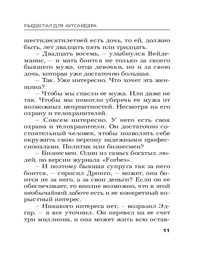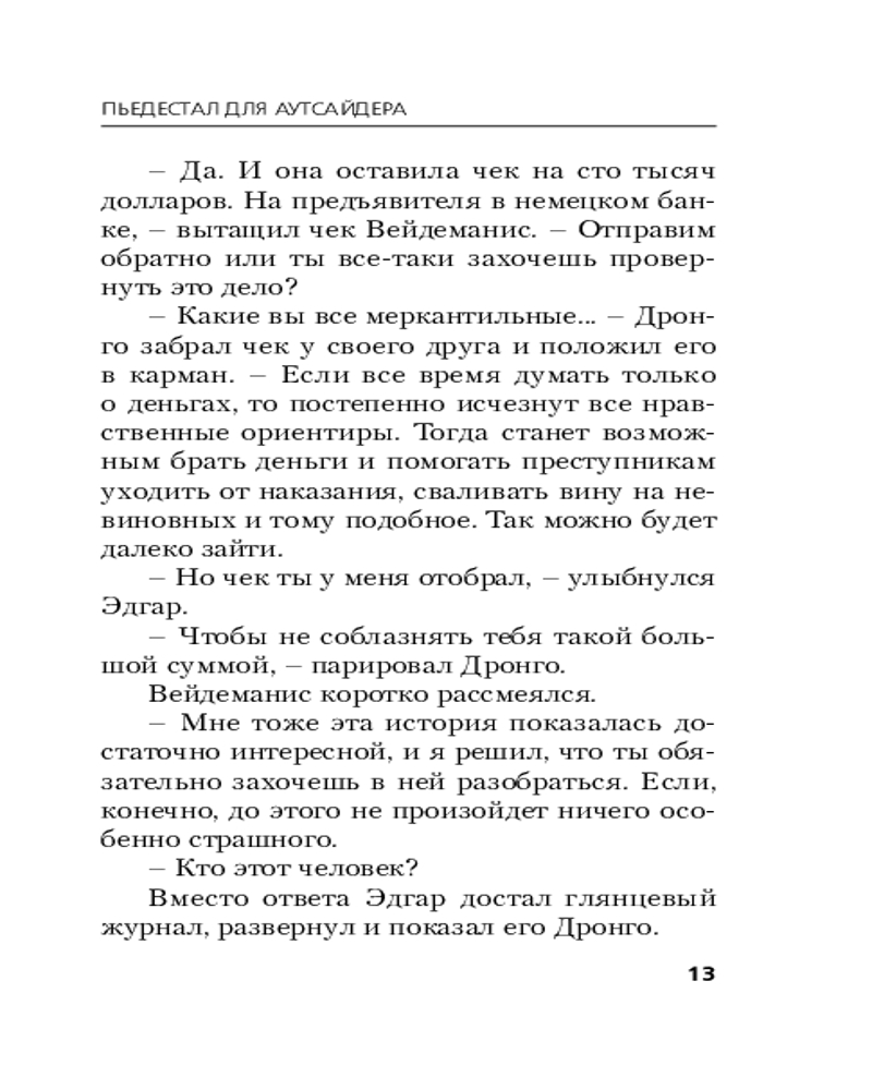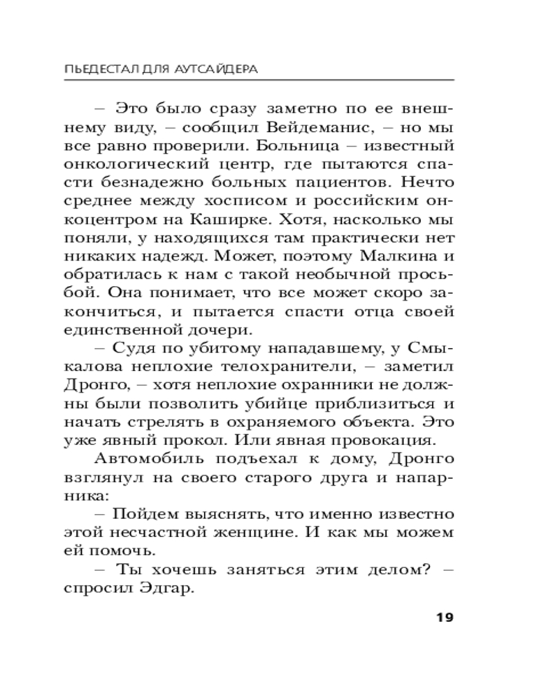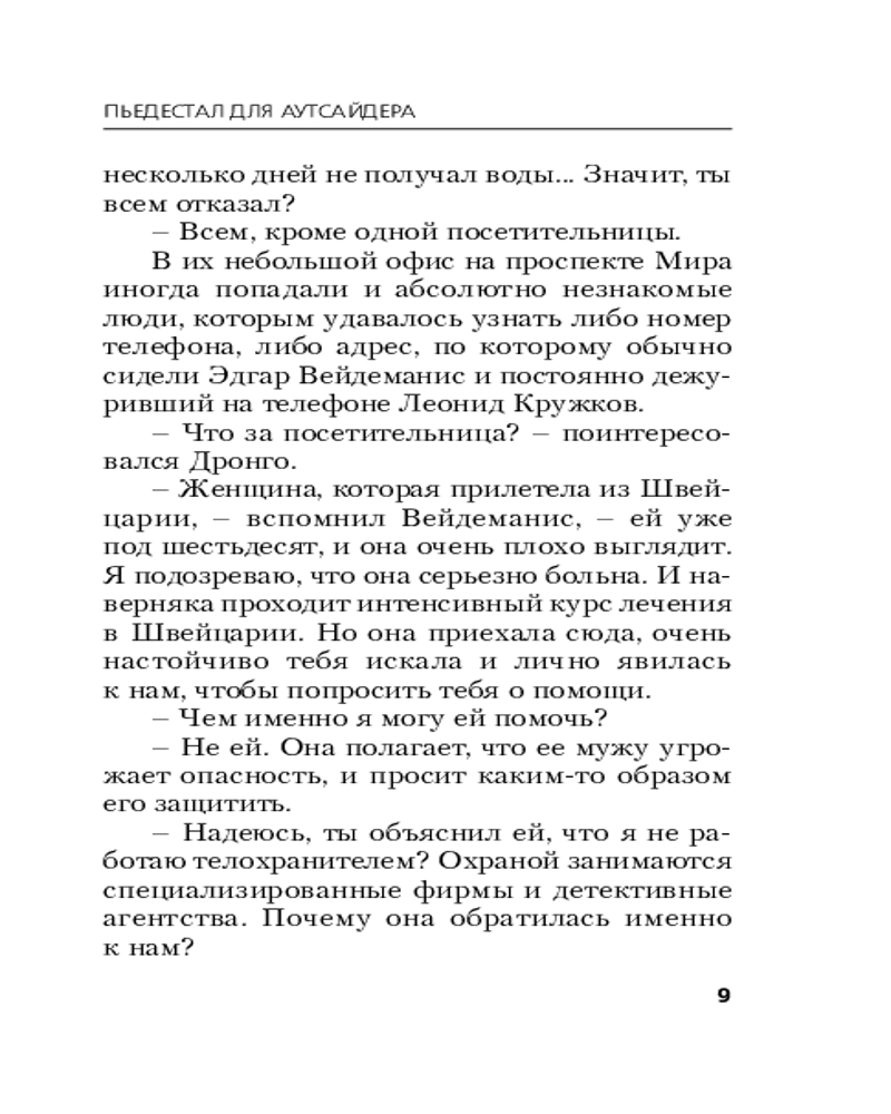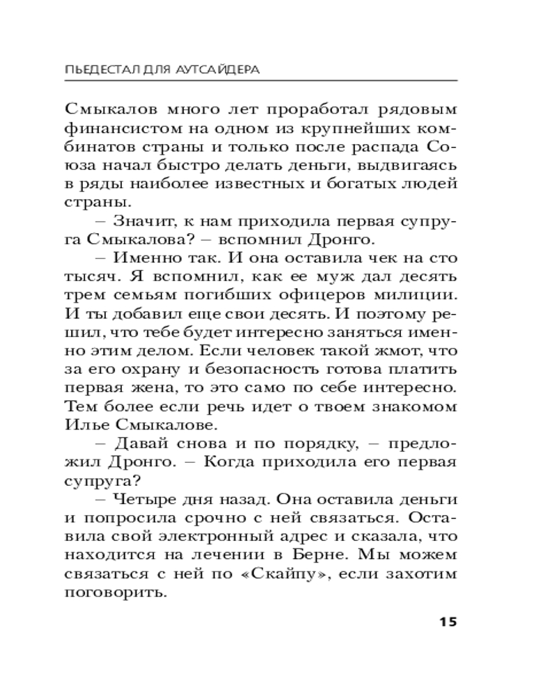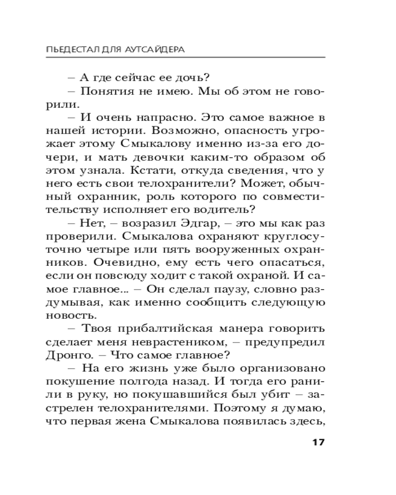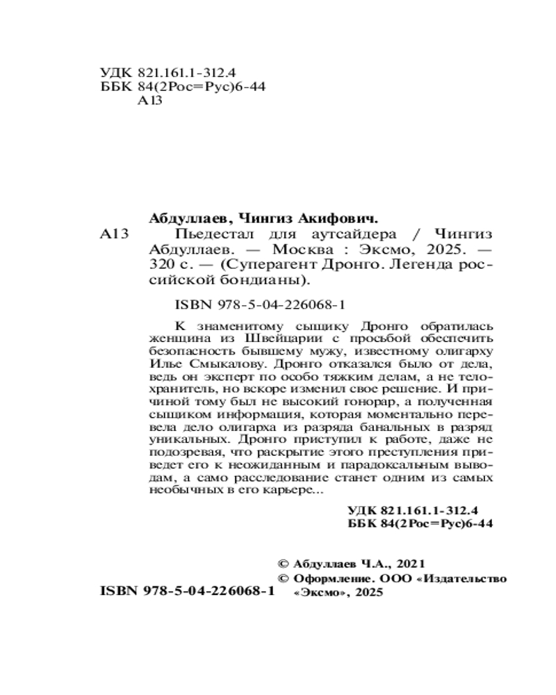 💳 Оплатить за товар можно при получении 🇰🇿 Есть бесплатная доставка по Казахстану 🎁 Копите бонусы с каждой покупки Серия: Суперагент Дронго. Легенда российской бондианы К знаменитому сыщику Дронго обратилась женщина из Швейцарии с просьбой обеспечить безопасность бывшему мужу, известному олигарху Илье Смыкалову. Дронго отказался было от дела, ведь он эксперт по особо тяжким делам, а не телохранитель, но вскоре изменил свое решение. И причиной тому был не высокий гонорар, а полученная сыщиком информация, которая моментально перевела дело олигарха из разряда банальных в разряд уникальных. Дронго приступил к работе, даже не подозревая, что раскрытие этого преступления приведет его к неожиданным и парадоксальным выводам, а само расследование станет одним из самых необычных в его карьере... |