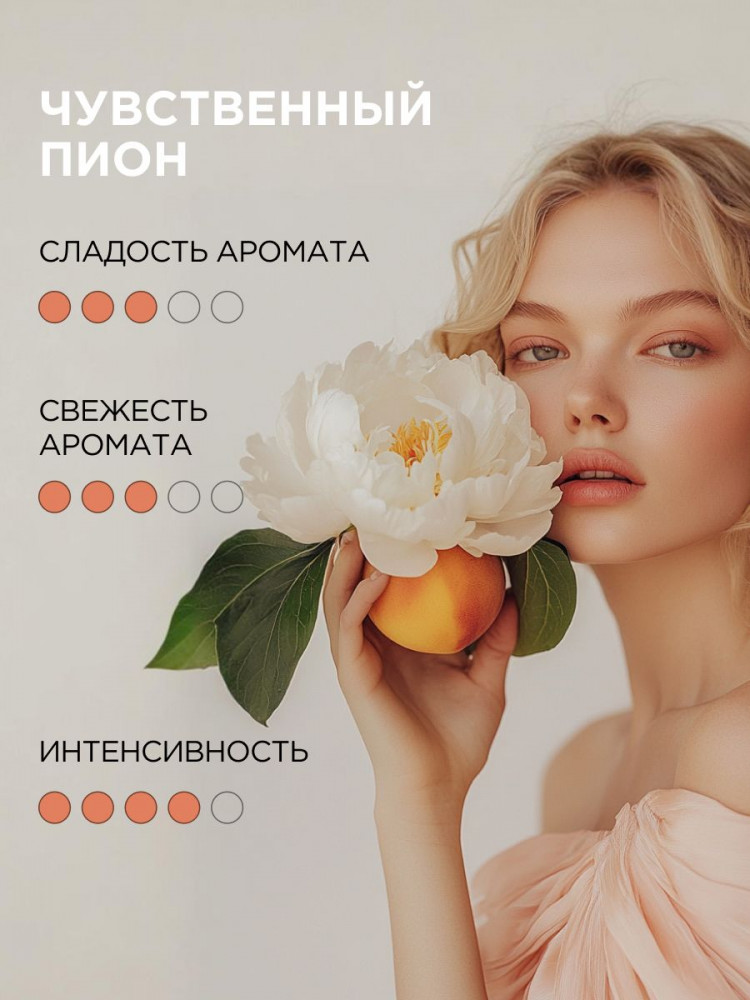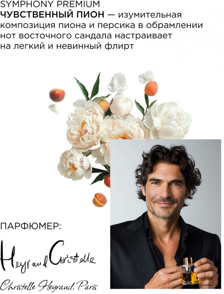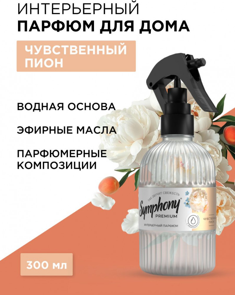 Создайте дома неповторимую атмосферу с интерьерным освежителем воздуха Symphony Premium Чувственный пион. Разработанная лучшими парижскими парфюмерами, изумительная композиция пиона и персика в обрамлении нот восточного сандала настраивает на легкий и невинный флирт. Активные вещества, в составе средства, нейтрализуют неприятные запахи, а эфирные масла раскрывают аккорды парфюмерного аромата.