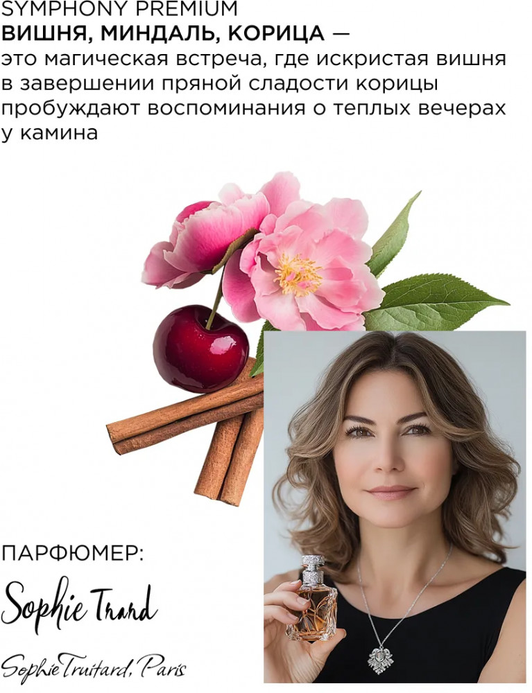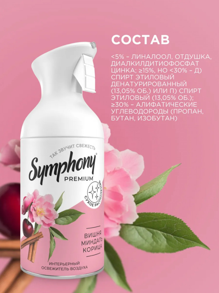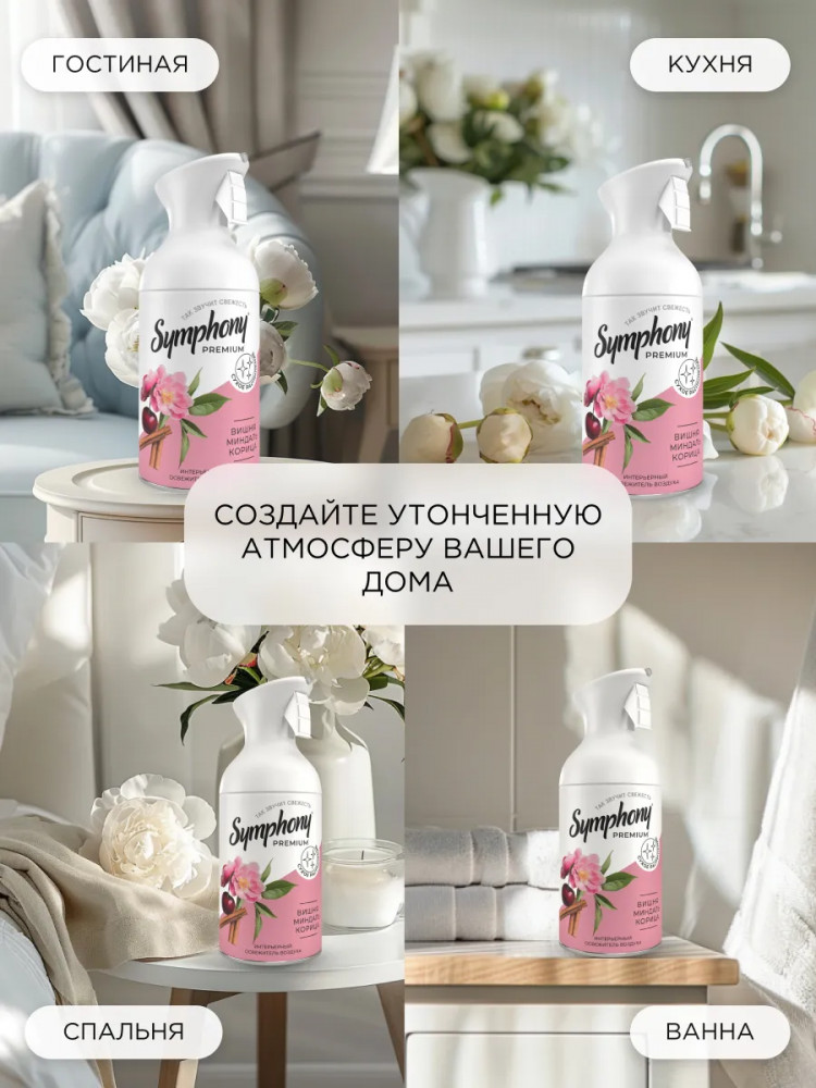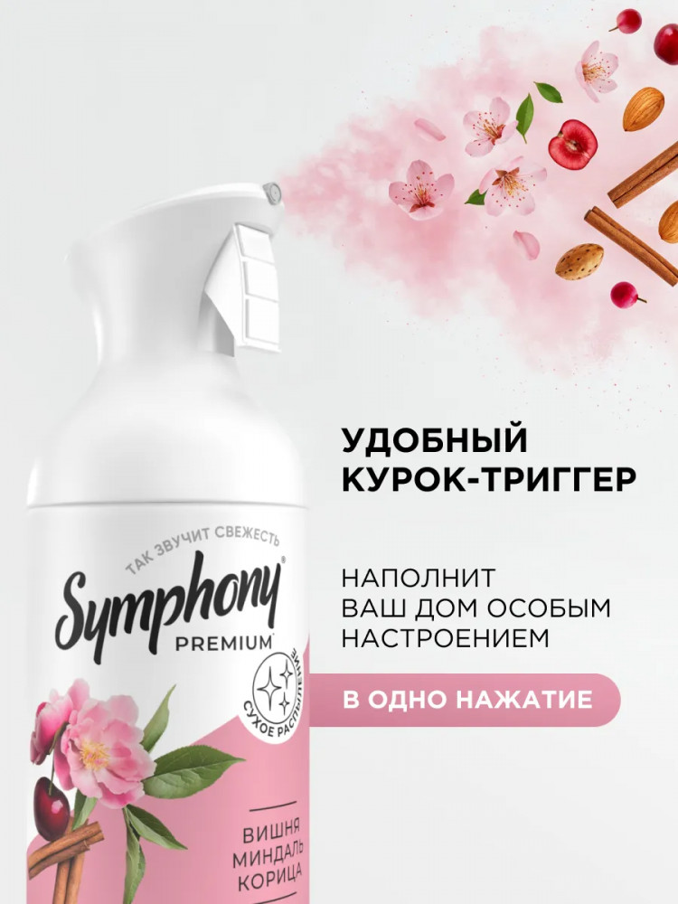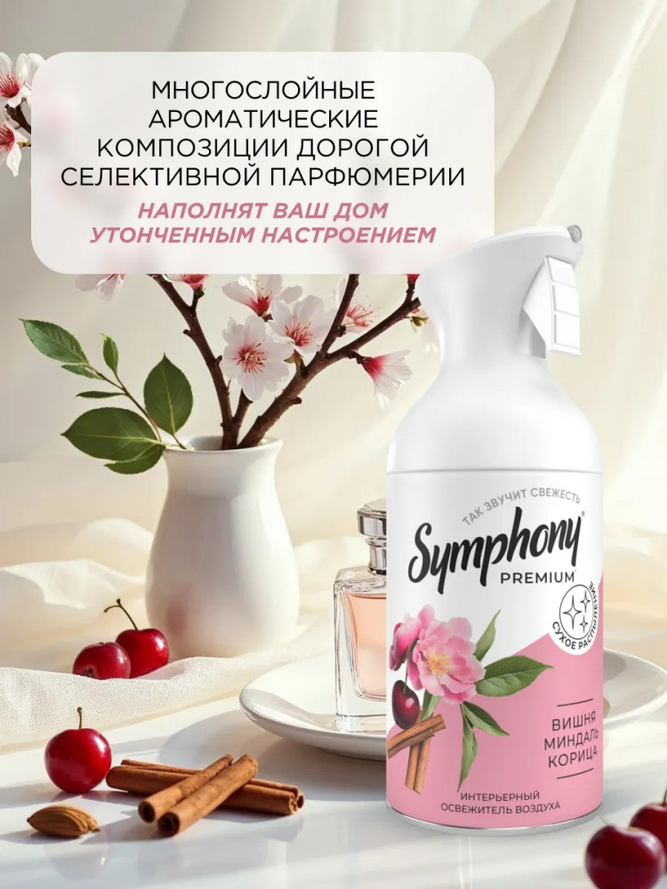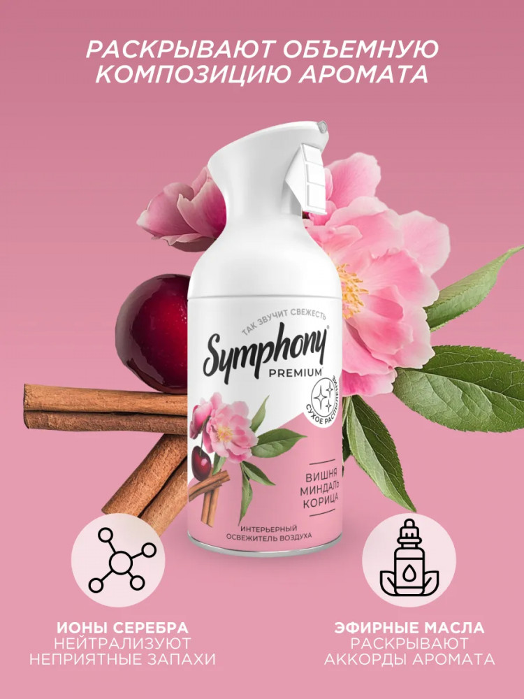 Создайте дома неповторимую атмосферу с интерьерным освежителем воздуха Symphony Premium «Вишня, миндаль, корица». Разработанная лучшими парижскими парфюмерами, эта магическая композиция, где искристая вишня в завершении пряной сладости корицы пробуждают воспоминания о теплых вечерах у камина. Ионы серебра, в составе средства, нейтрализуют неприятные запахи, а эфирные масла раскрывают аккорды парфюмерного аромата.
