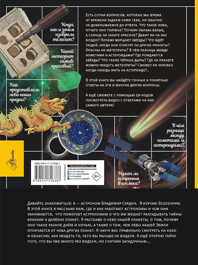💳 Оплатить за товар можно при получении 🇰🇿 Есть бесплатная доставка по Казахстану от 1 дня 🎁 Копите бонусы с каждой покупки Серия: Первая энциклопедия с видеоуроками В этой книге вы найдёте ответы на самые часто задаваемые автору — известному астроному Владимиру Сурдину — космические вопросы. В чём разница между звездой и планетой, кометами и астероидами? Как и где рождаются звёзды? Существуют ли звёзды в 1000 раз массивнее Солнца? Как измерили огромные расстояния до звёзд и галактик? Как спастись от астероида? Чем грозят нам кометы? Что такое квазар и пульсар? И конечно, ответ на самый популярный вопрос: что такое чёрные дыры? Ответы короткие и понятные, кроме того, воспользовавшись любым гаджетом и QR-кодом из книги, вы сможете посмотреть видеозапись с ответом автора. Усваиваем знания, подтягиваем свое образование в любом возрасте! |