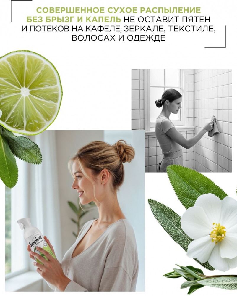 Совершенное сухое распыление, без брызг и капель, не оставит пятен и потеков на кафеле, зеркале, текстиле, волосах и одежде. Аэрозольный распылитель Симфония идеально подойдет для кухни, гостиной, туалета, унитаза и ванной комнаты, нейтрализуя даже стойкие запахи, обеспечивая долгое ощущение чистоты. Компактный ароматизатор-спрей позволяет удобно и равномерно распылять средство, делая его незаменимым помощником в уходе за туалетной зоной.
