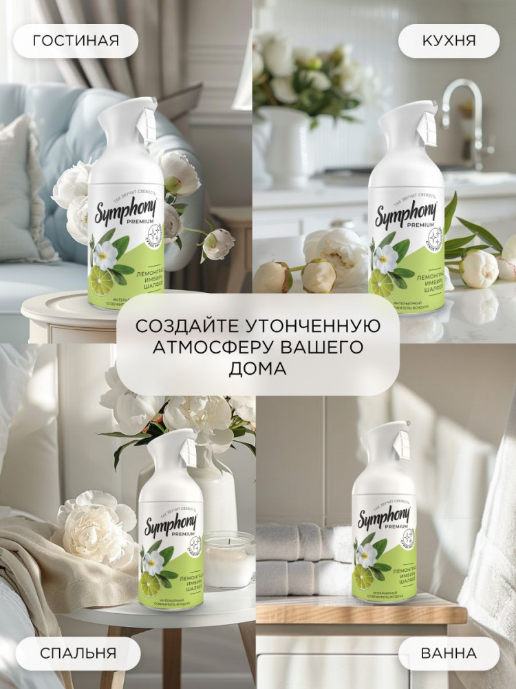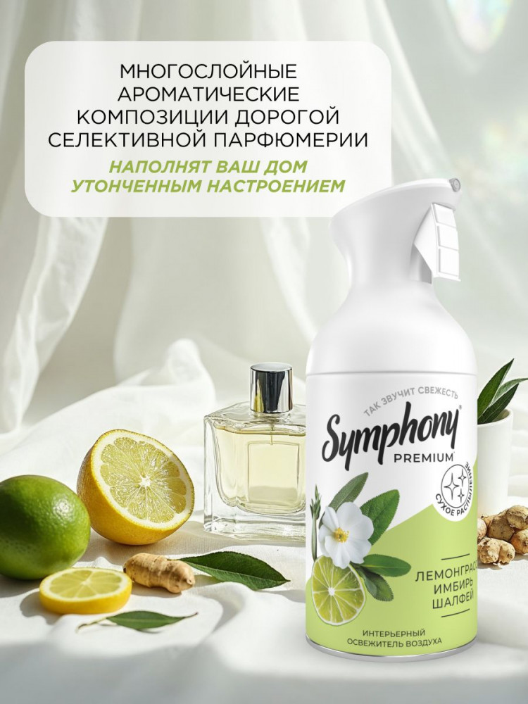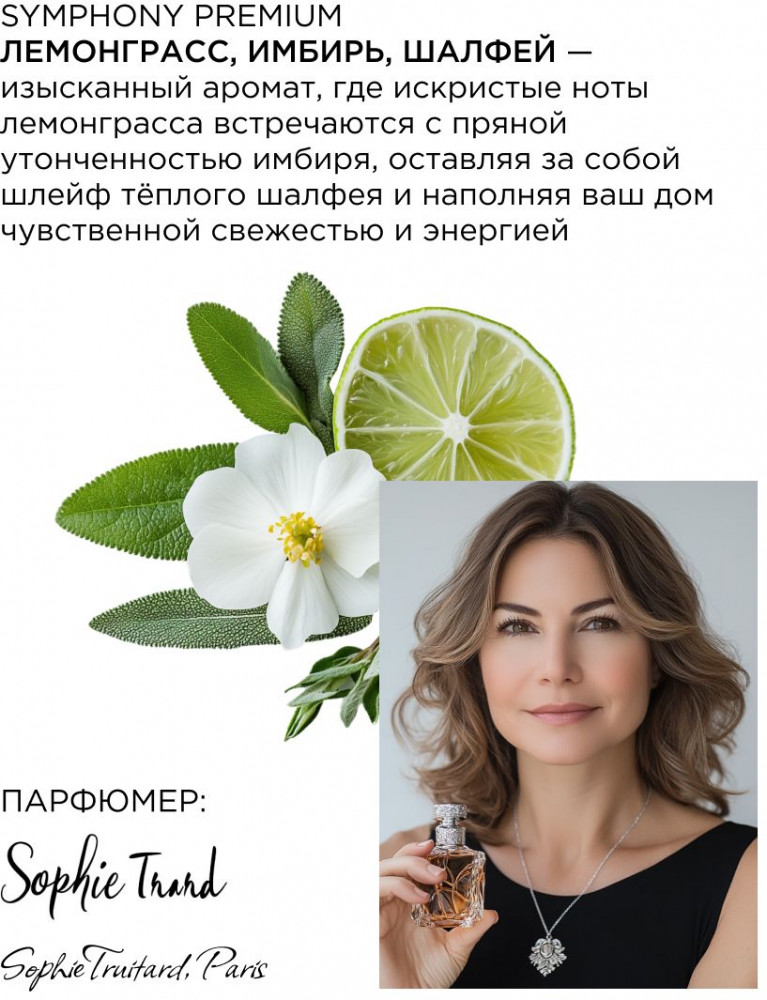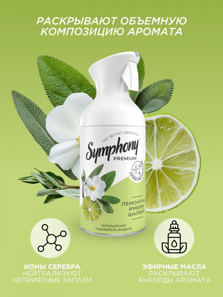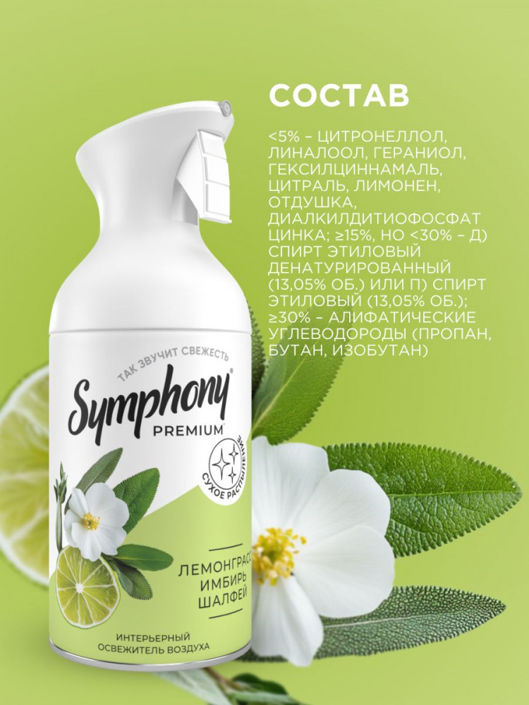 Создайте дома неповторимую атмосферу с интерьерным освежителем воздуха Symphony Premium «Лемонграсс, имбирь, шалфей». Разработанный лучшими парижскими парфюмерами, изысканный аромат, где искристые ноты лемонграсса встречаются с пряной утонченностью имбиря, оставляя за собой шлейф тёплого шалфея и наполняя ваш дом чувственной свежестью и энергией. Ионы серебра, в составе средства, нейтрализуют неприятные запахи, а эфирные масла раскрывают аккорды парфюмерного аромата.