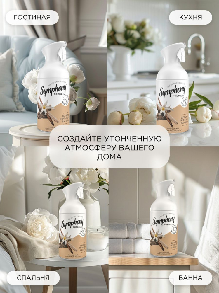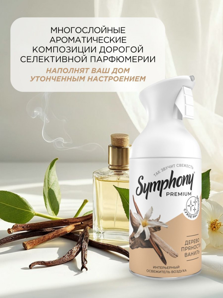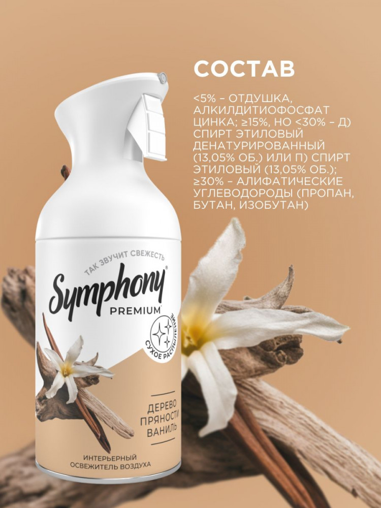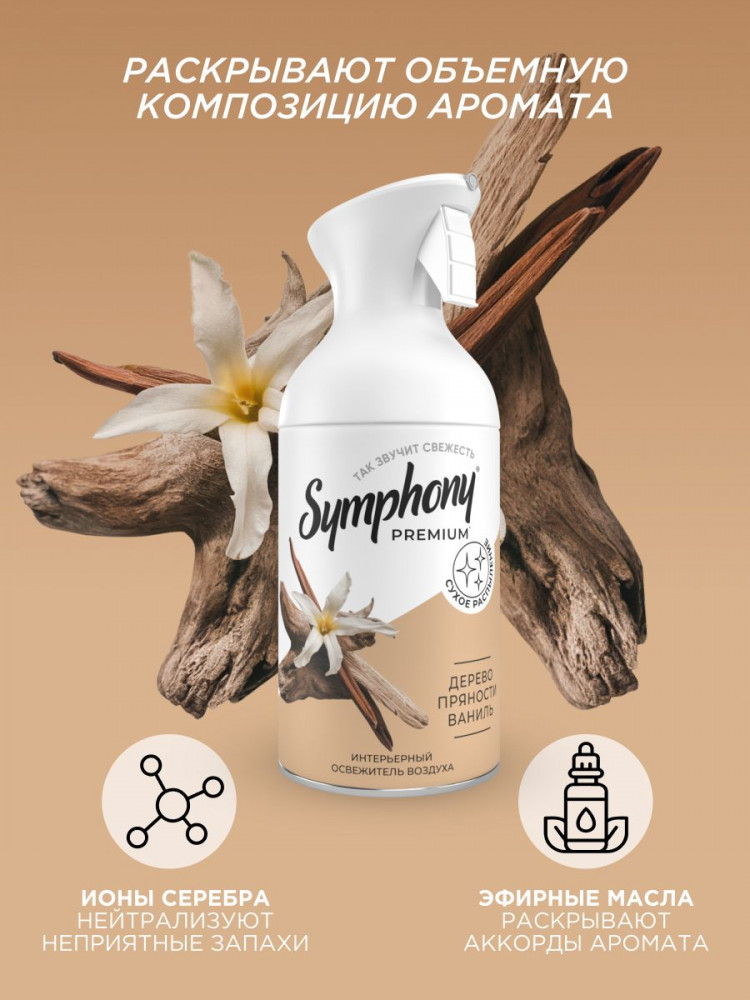 Создайте дома неповторимую атмосферу с интерьерным освежителем воздуха Symphony Premium Дерево, пряности, ваниль. Разработанная лучшими парижскими парфюмерами, композиция уюта и тайны, где пикантные верхние ноты листа табака и специй переплетаются с нежной сладостью ванили и бобов тонка, создавая неповторимое тепло в основании глубоких древесных нот. Ионы серебра, в составе средства, нейтрализуют неприятные запахи, а эфирные масла раскрывают аккорды парфюмерного аромата.
