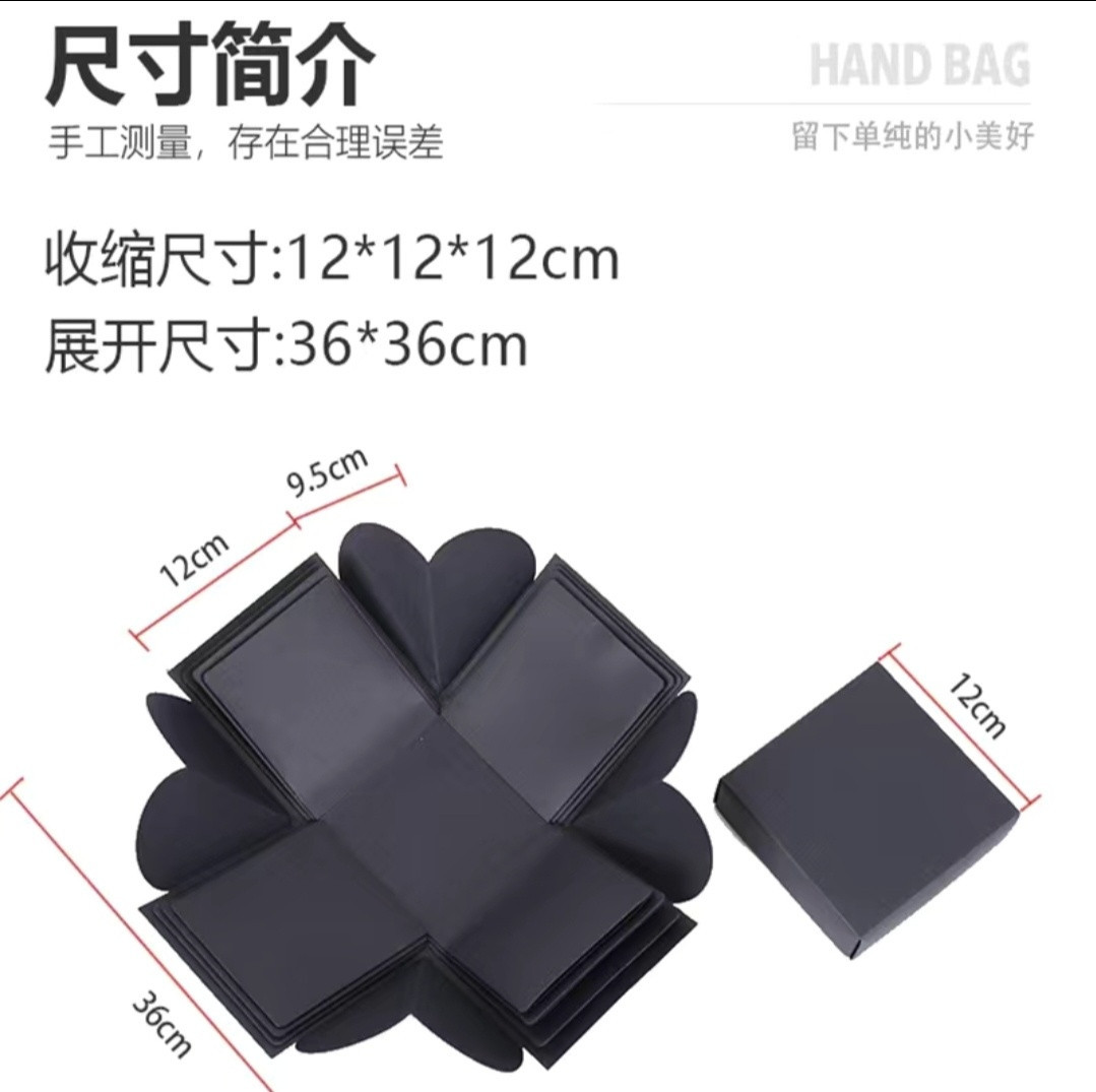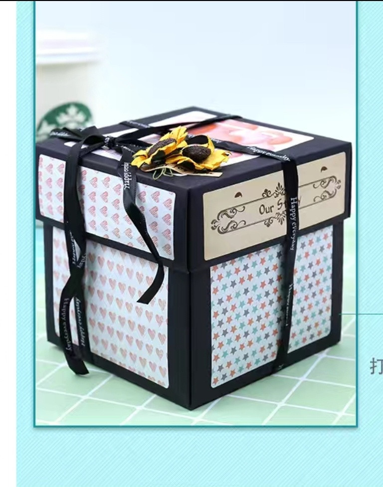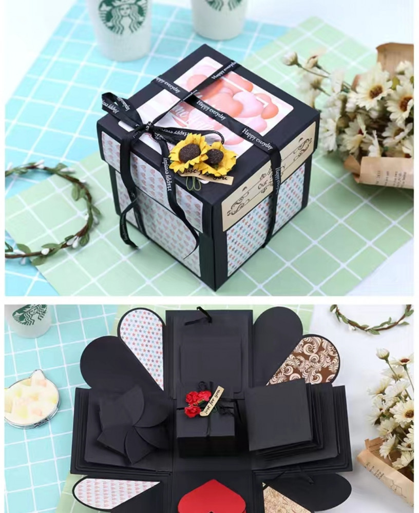 При открытии крышки стенки коробки «взрываются» или падают в стороны, открывая внутреннее содержимое и слои украшений. Внутри находятся небольшие отделения, кармашки и места для фотографий или других мелких сувениров. В центре обычно располагается еще одна маленькая подарочная коробочка для основного подарка. Такие коробки изготавливаются из картона, персонализированы для разных случаев, таких как дни рождения или годовщины.