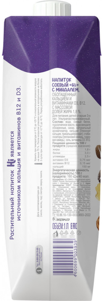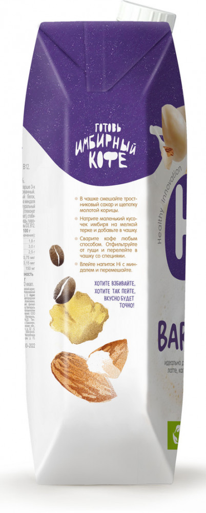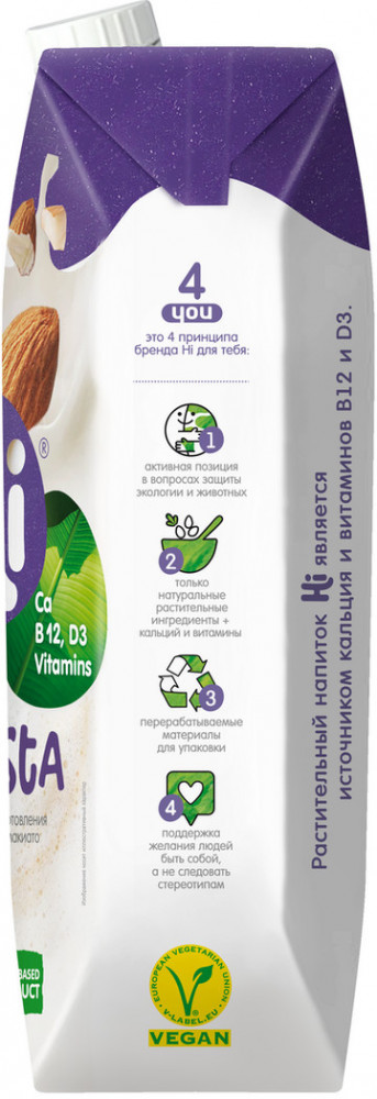 Вода, соевый белок, подсолнечное масло, паста из ядер орехов миндаля обжаренного, сахар, натуральный ароматизатор, кальций (глюконат кальция), соль, эмульгатор (эфиры диацетилвинной и жирных кислот), стабилизаторы (геллановая камедь, гуаровая камедь), регуляторы кислотности (цитрат натрия, фосфат натрия, карбонат натрия), витамины В12, D3.