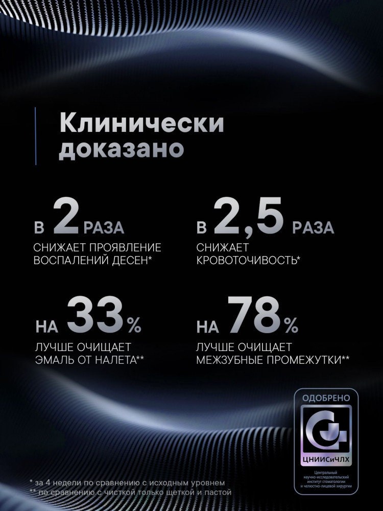 • 5 режимов интенсивности потока: высокий, стандартный, мягкий, режим микромассажа десен, пульсирующий;