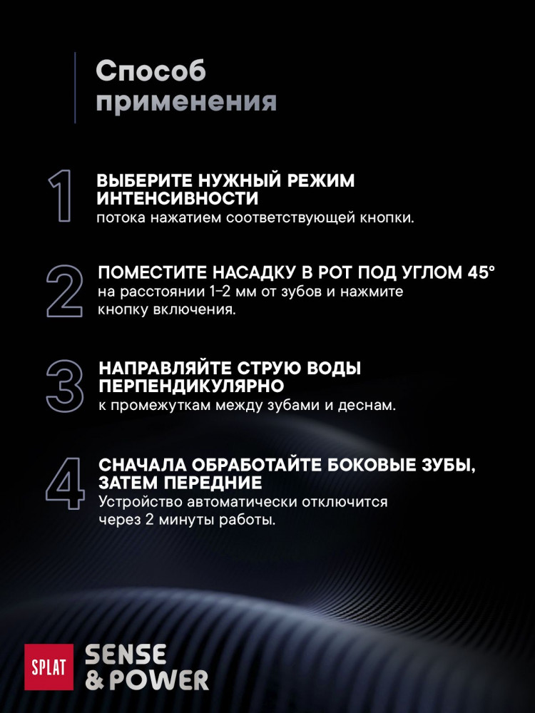 • не направляйте струю в глотку, нос, уши и другие части тела, кроме полости рта.