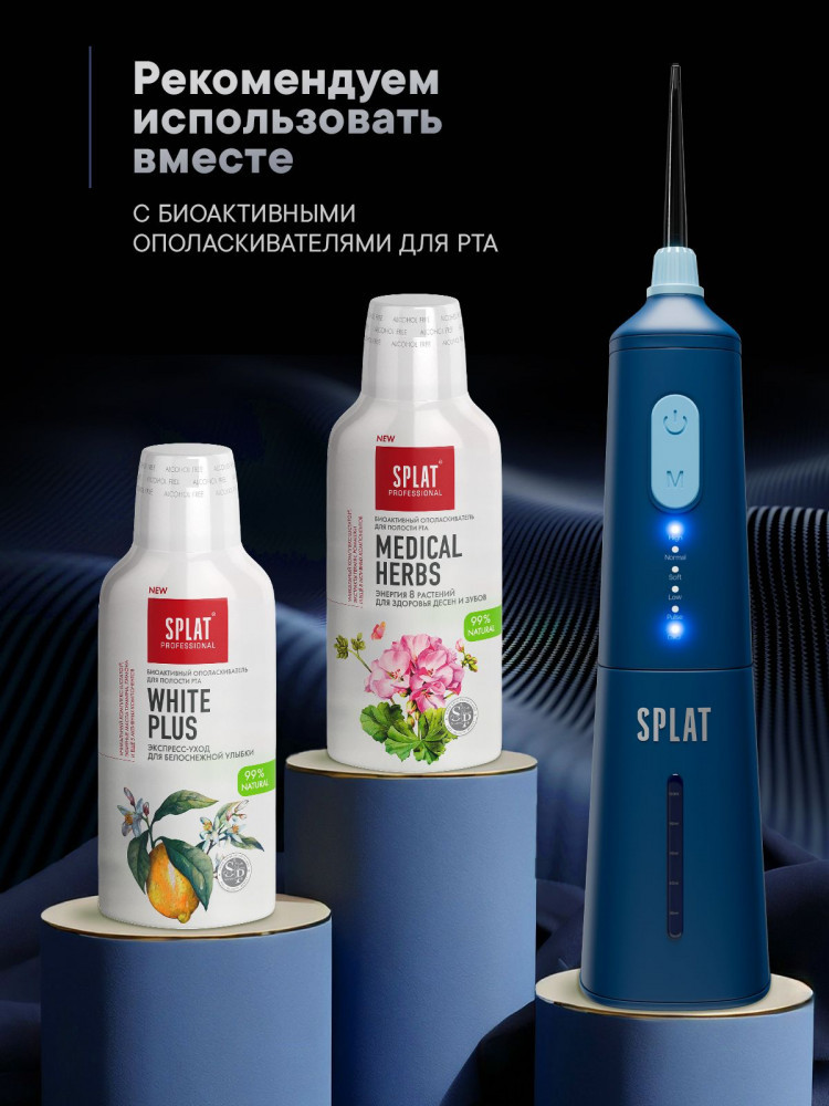 Портативный ирригатор с клинически доказанным эффектом: в 2,5 раз снижает кровоточивость десен в 2 раза снижает проявление воспалений десен на 33% лучше очищает эмаль от налета на 78% лучше очищает межзубные промежутки 5 режимов позволят вам подобрать идеальный для себя вариант В комплекте 6 сменных насадок: 2 классические 1 ортодонтическая 1 скребок для языка 1 для снятия налета 1 пародонтальная.