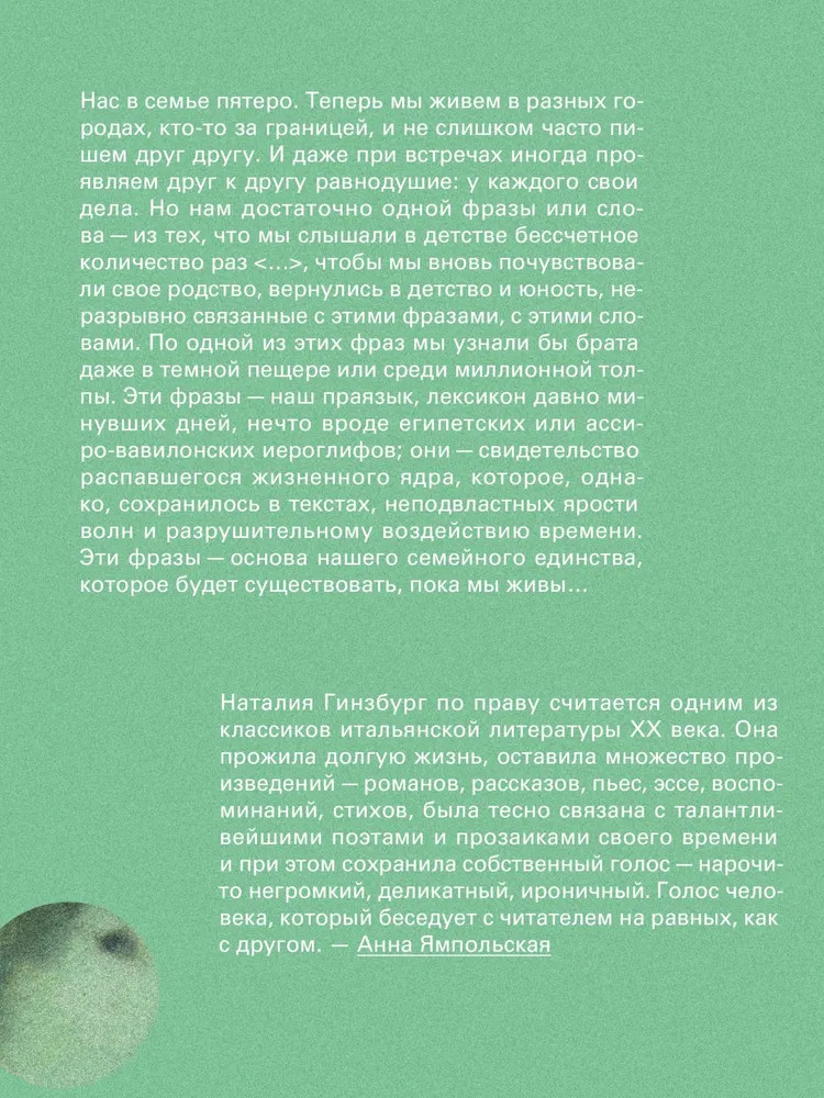 💳 Оплатить за товар можно при получении 🇰🇿 Есть бесплатная доставка по Казахстану 🎁 Копите бонусы с каждой покупки Познакомьтесь со взбалмошным семейством Леви, с их причудами и ежедневными ритуалами, память о которых хранят излюбленные словечки, диалектные выражения и лишь им одним понятные присказки — из тех, что всегда рождаются в кругу близких людей. Джузеппе Леви — энергичный ученый, медик, заядлый спортсмен и непримиримый спорщик. Его жена Лидия, размеренная и добродушная любительница искусства, ледяных душей и яблок карпандю. Их пятеро очень разных детей, растущих в доме, где никогда не смолкают голоса гостей — интеллектуалов, политиков, художников. Все они живут в Турине в первой половине XX века, у власти Муссолини, и несогласные с его политикой подвергаются гонениям и арестам. Свободолюбивые Леви — евреи и убежденные антифашисты — даже в самые темные времена не теряют юмора и легкого отношения к жизни, они борются за свои убеждения и своих близких, ищут и находят спасение друг в друге. |