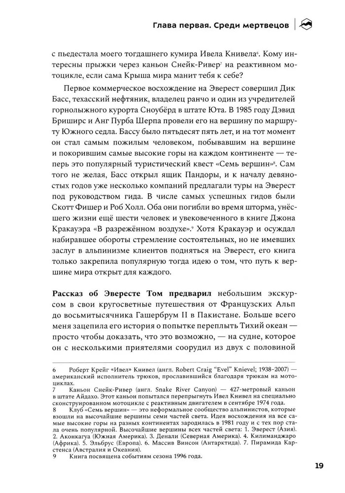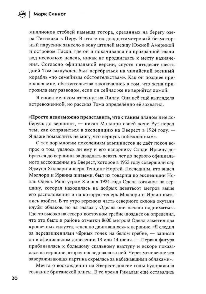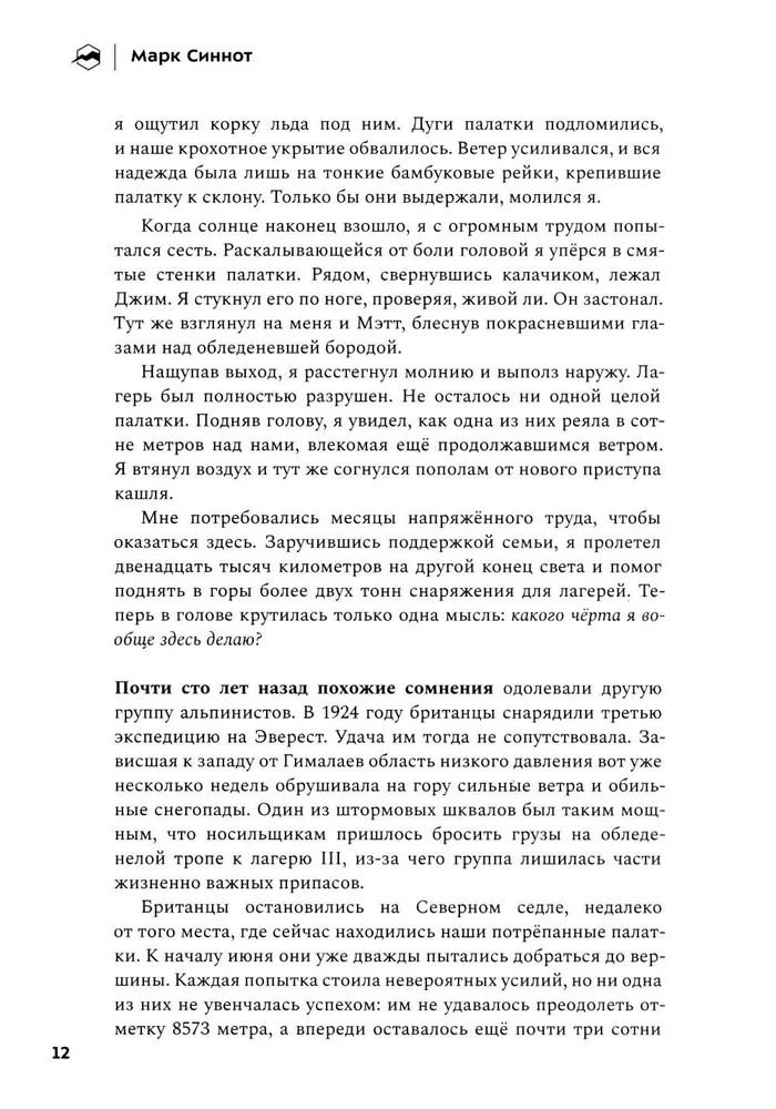 Весной 2019 года бывалый альпинист Марк Синнот отправился в экспедицию к вершине Эвереста, влекомый неутолимым желанием разгадать вековую загадку и отыскать останки британского альпиниста Эндрю Ирвина. Буря, грянувшая в разгар восхождения, чёрным днём осталась в памяти участников тех событий. Так родилось это повествование о замечательных людях, дружбе, принятии трудных решений и, в первую очередь, о горе, которая поглотит вашу душу — и вашу жизнь, — если вы позволите ей это сделать. |