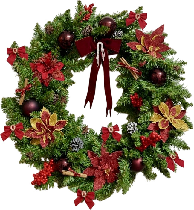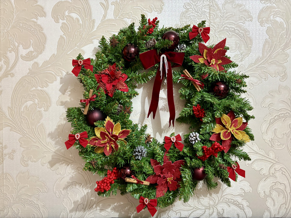 Данный рождественский венок сделан вручную с особой любовью и вниманием к деталям. Его особенностью является присутствие натуральных материалов — шишек, подияна, корицы и ванильных палочек, благодаря которым создается неповторимый аромат и атмосфера настоящего Нового года и Рождества. Тонкий пряный запах венка напоминает уютный аромат глинтвейна, дарит ощущение тепла, домашнего уюта и зимней сказки. Яркие акценты в виде декоративных ягод, бантиков и елочной хвои делают венок идеальным украшением для двери, камина или праздничного стола. Такой венок станет не просто элементом декора, а душевным символом праздника, который подарит настроение волшебства и ожидания чуда каждому дому.