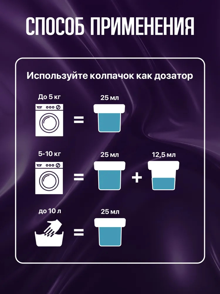 • при ручной стирке 1 колпачок средства добавьте к 10 литрам воды при последнем полоскании и выдержите одежду в этом растворе 3-5 минут. Повторно полоскать бельё после этого не нужно.