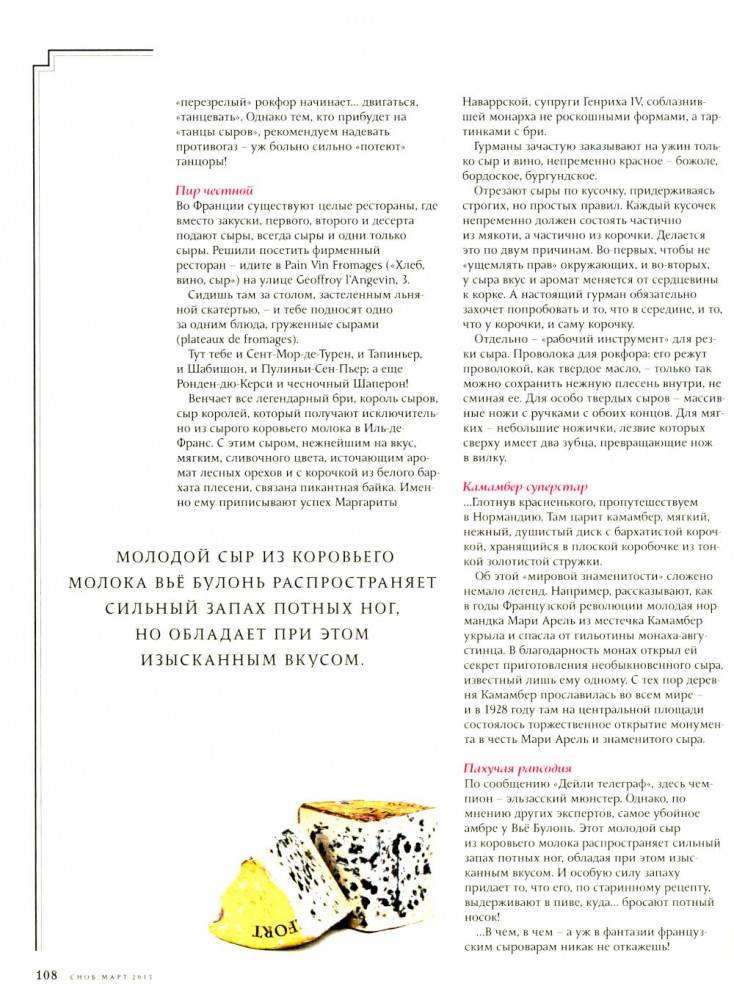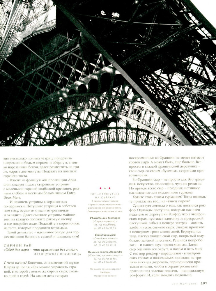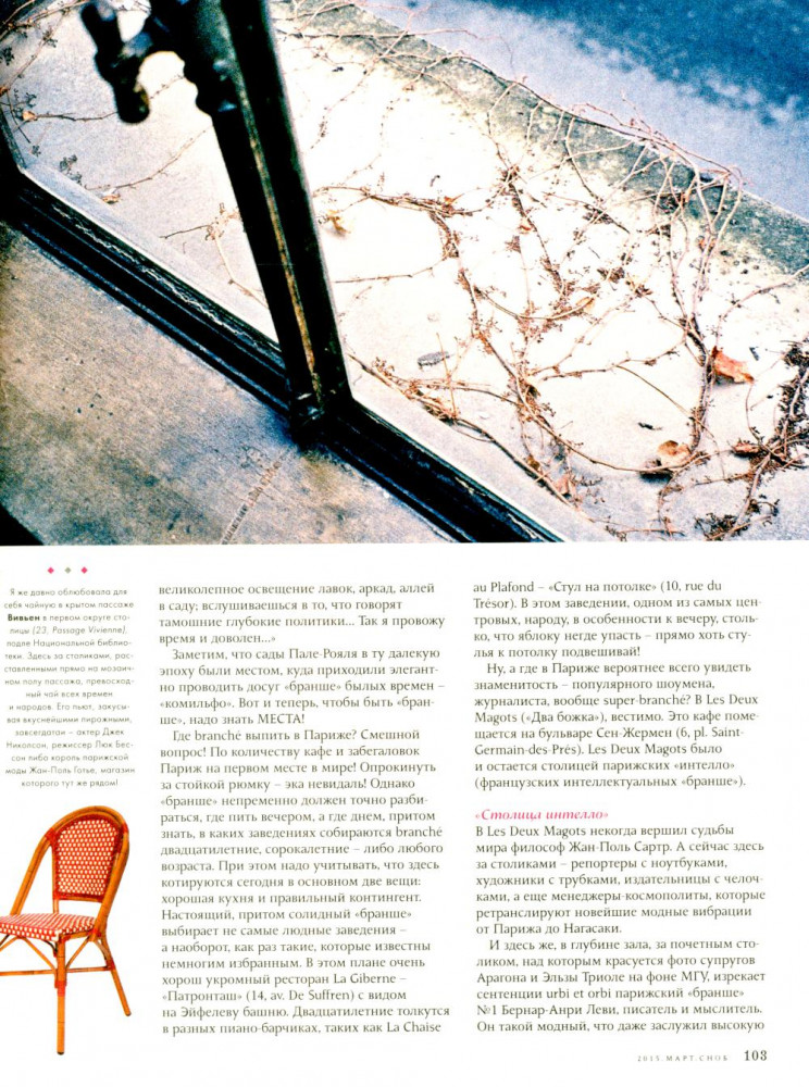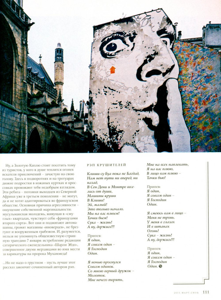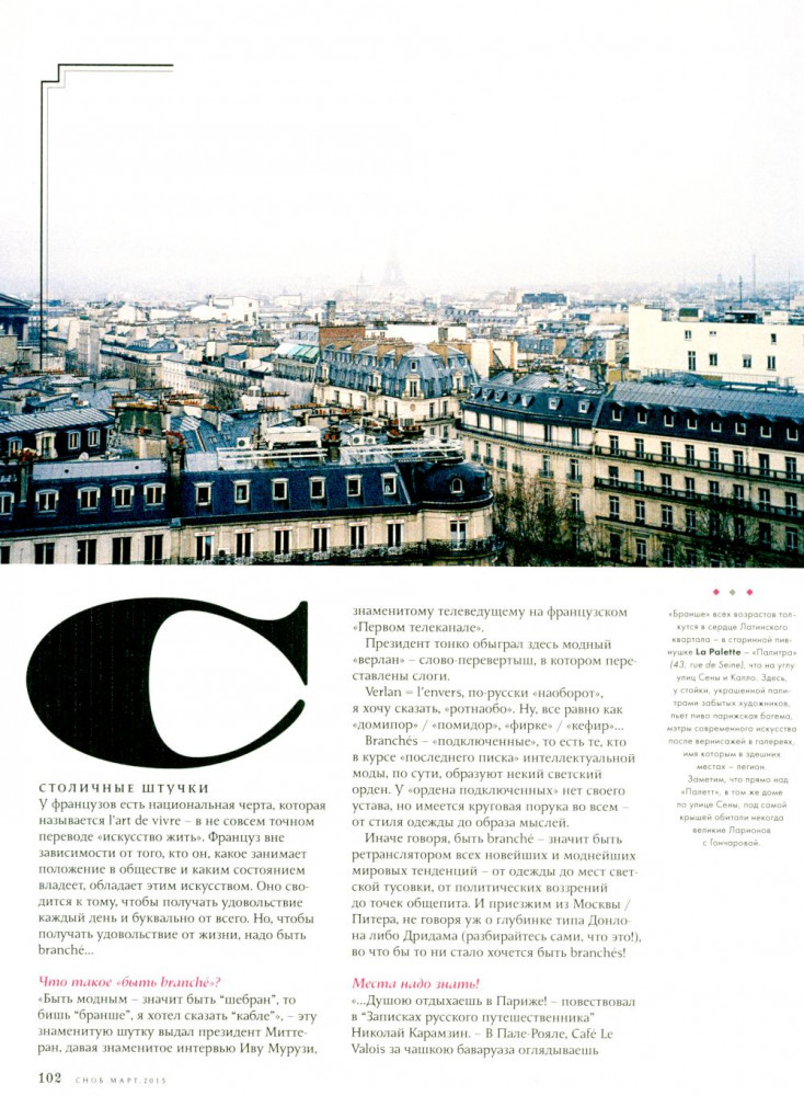 Журнал «Сноб». Выпуск №2, март 2015В данный момент этот товар отсутствует в продаже. Возможно, у нас найдется аналогичный или похожий товар здесь. Серия: С-П ...А еще в этом номере много Парижа, его воздуха, запахов, ароматов и света. Все проходит, а он остается. Все меняется, а он все так же прекрасен. И мысль о нем, как и надежда на новую встречу, заставляет совсем по-другому относиться к собственным горестям и потерям. Поэтому скажем ему, как говорят парижане друг другу: A demain! И пусть это завтра уже скорее наступит. |