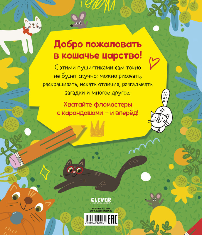 Серия: Clever-активити Добро пожаловать в кошачье царство! С этими пушистиками вам точно не будет скучно: можно рисовать, раскрашивать, искать отличия, разгадывать загадки и многое другое. Хватайте фломастеры с карандашами — и вперёд! |