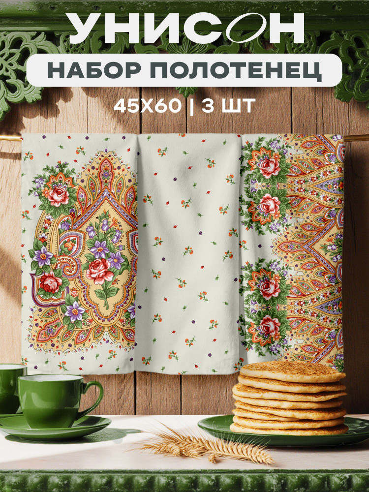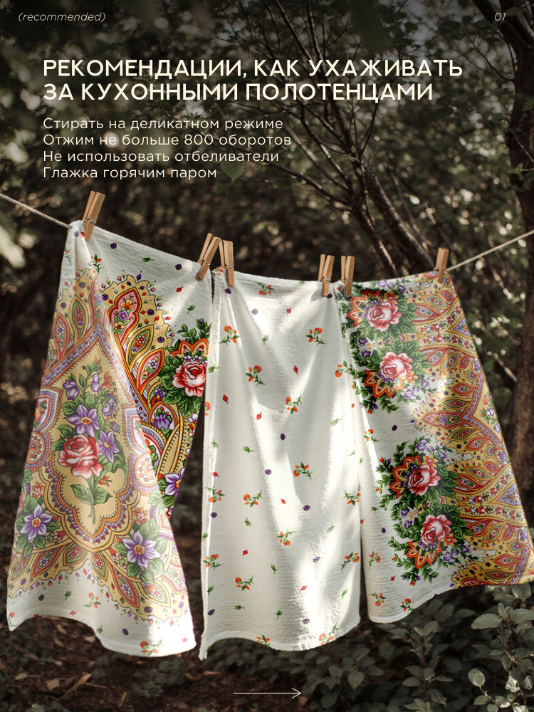 Бежевые полотенца с рисунком в русском стиле понравятся тем, кто ценит традиции. Комплект с узором Павловопосадский платок порадует любителей детализированных рисунков. Полотенчики с цветочным принтом — эстетичное приобретение для кухни, которое по-настоящему раскрывает нашу широкую душу! Такой рисунок передает народный русский колорит и соответствует тренду на традиции.