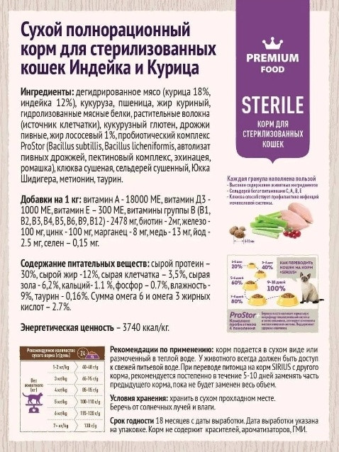 Sirius Сухой корм для стерилизованных кошек с индейкой и курицей