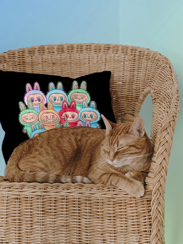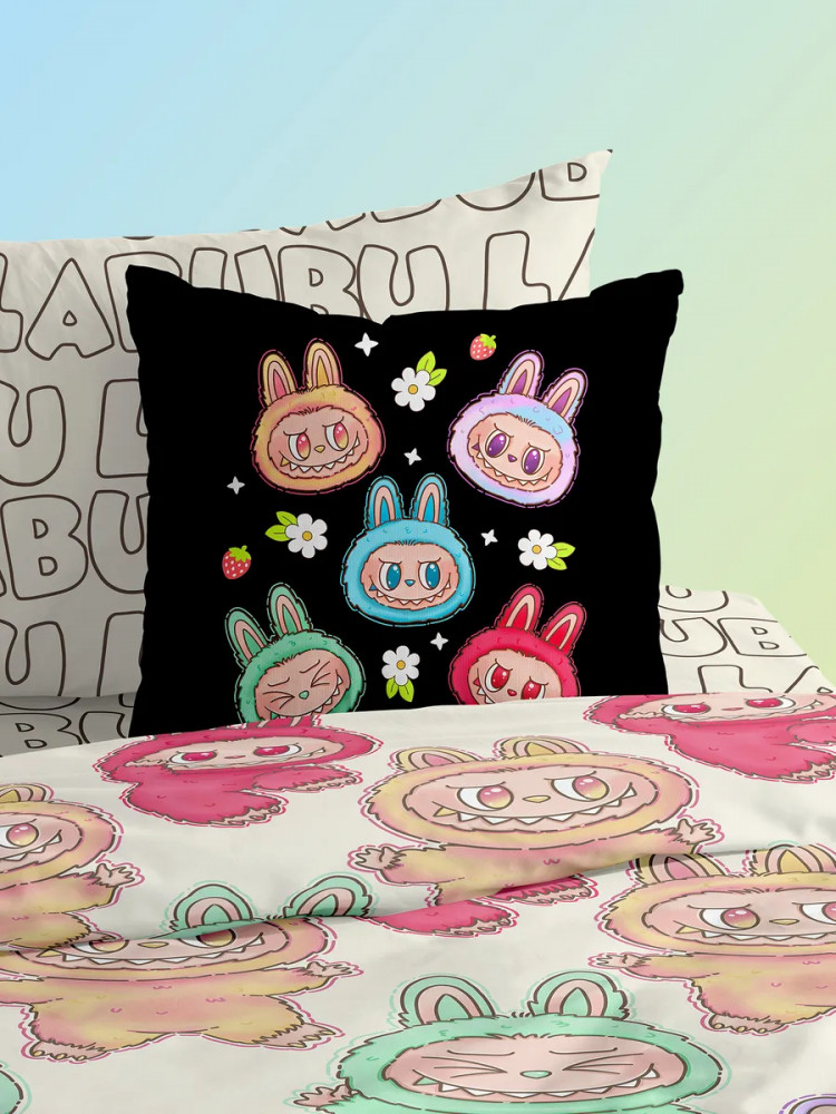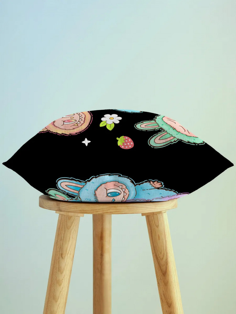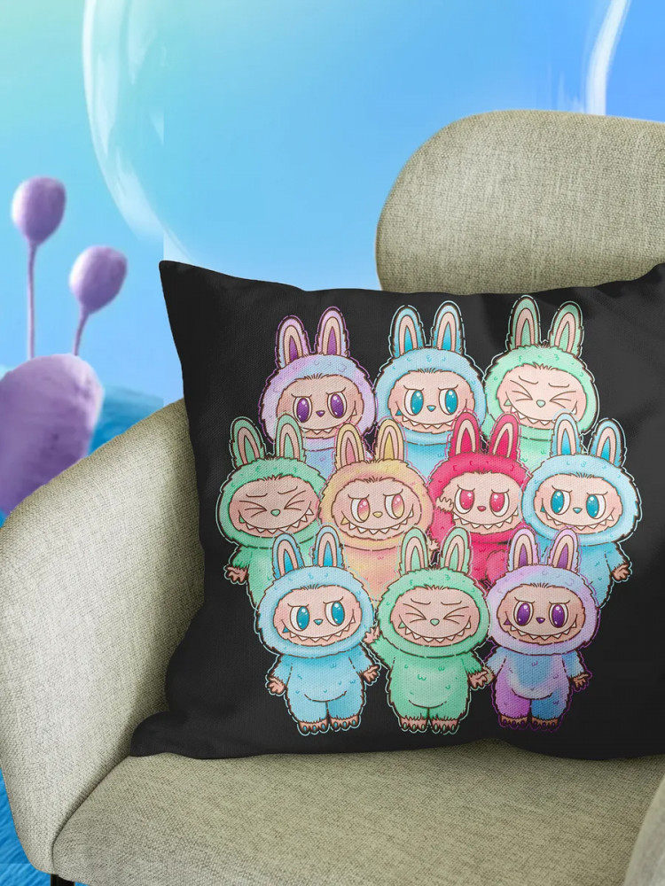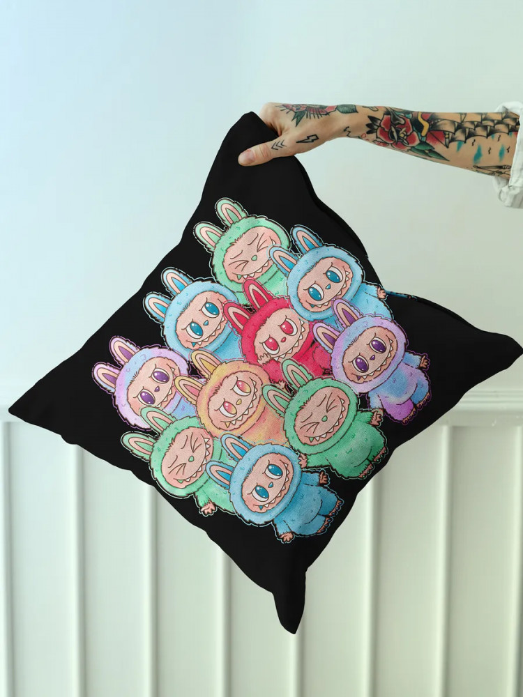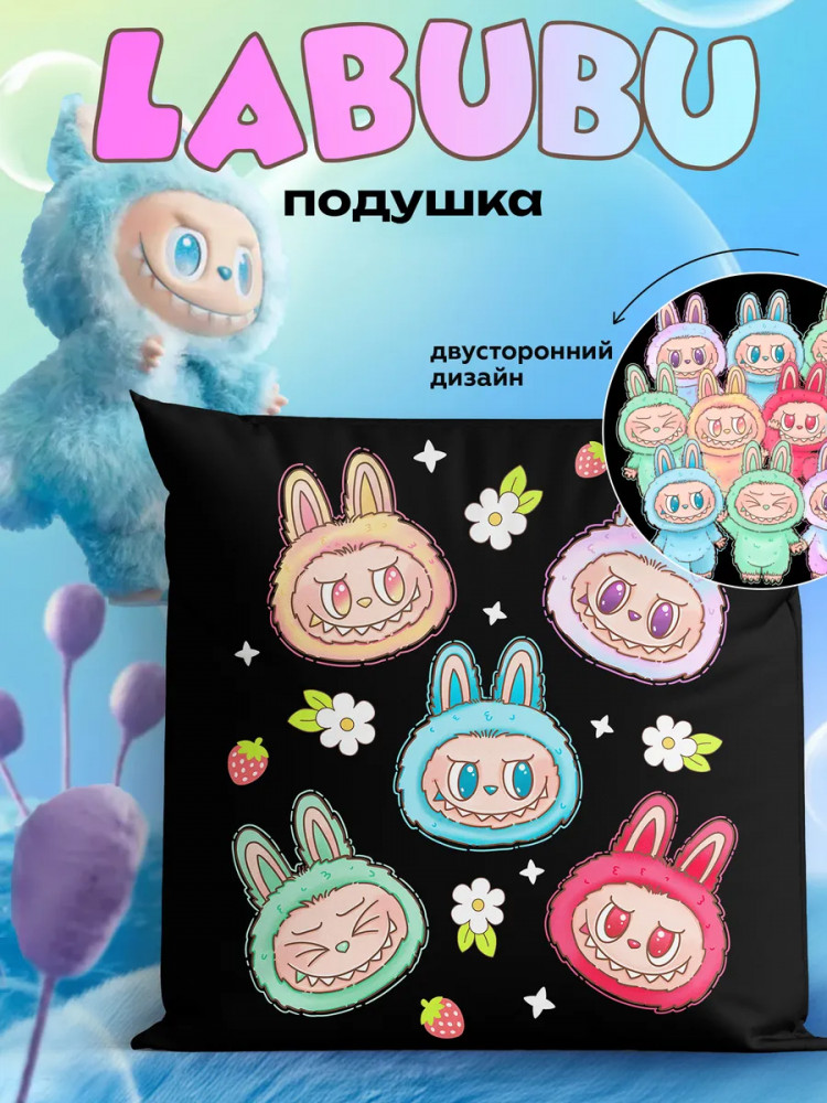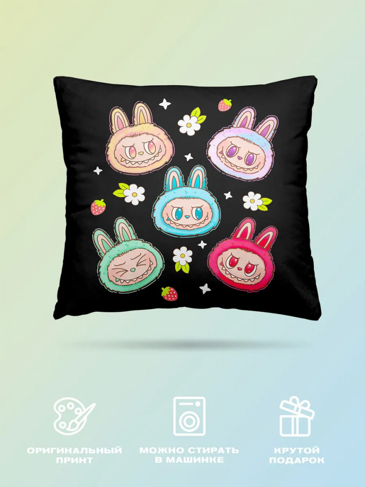 Долой рутину: трендовая декоративная подушка 40×40 см с Лабубу — лучшее средство от скуки! Черная подушка с популярными монстриками — находка для тех, кто следит за трендами и всегда знает, что сейчас в моде. Хайповые Labubu от Pop Mart/Поп Март — мечта современных девушек и парней. Разноцветный принт порадует фанатов игрушки и тех, кто кайфует от Skullpanda/Скуллпанда и фигурок Cry Baby. Подушка является двухсторонней, и с обеих сторон — разные изображения с милыми игрушками, которые делают ее кайфовым предметом декора для детей, девочек и мальчиков.
