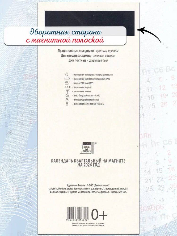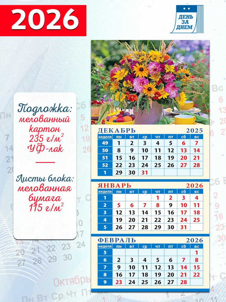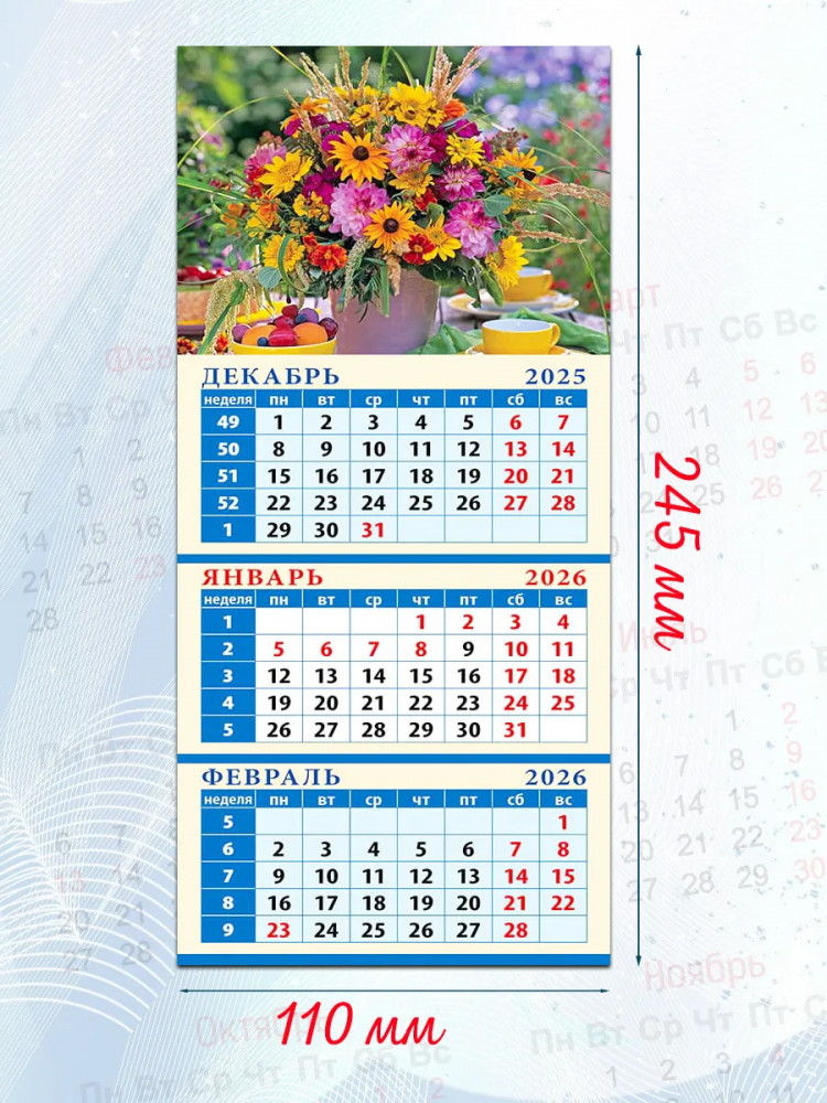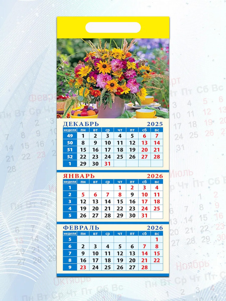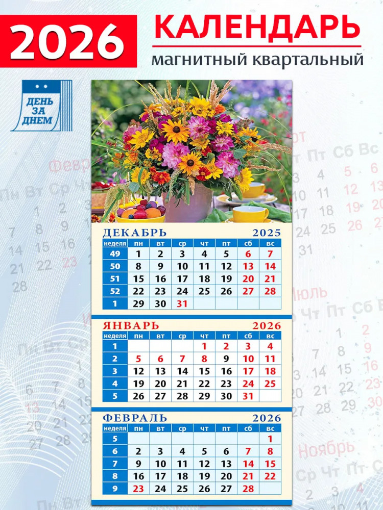 Календарь квартальный на магните на 2026 год «Летний букет»В данный момент этот товар отсутствует в продаже. Возможно, у нас найдется аналогичный или похожий товар здесь. Квартальный календарь на магните на 2026 год — это удобный инструмент для планирования, который объединяет обзор трех месяцев на одном листе и надежно крепится на металлическую поверхность, помогая легко отслеживать график задач и событий. Его компактный размер и четкая разметка делают его практичным аксессуаром для кухни, рабочего кабинета или офиса, дополняя пространство стильным и функциональным элементом. |