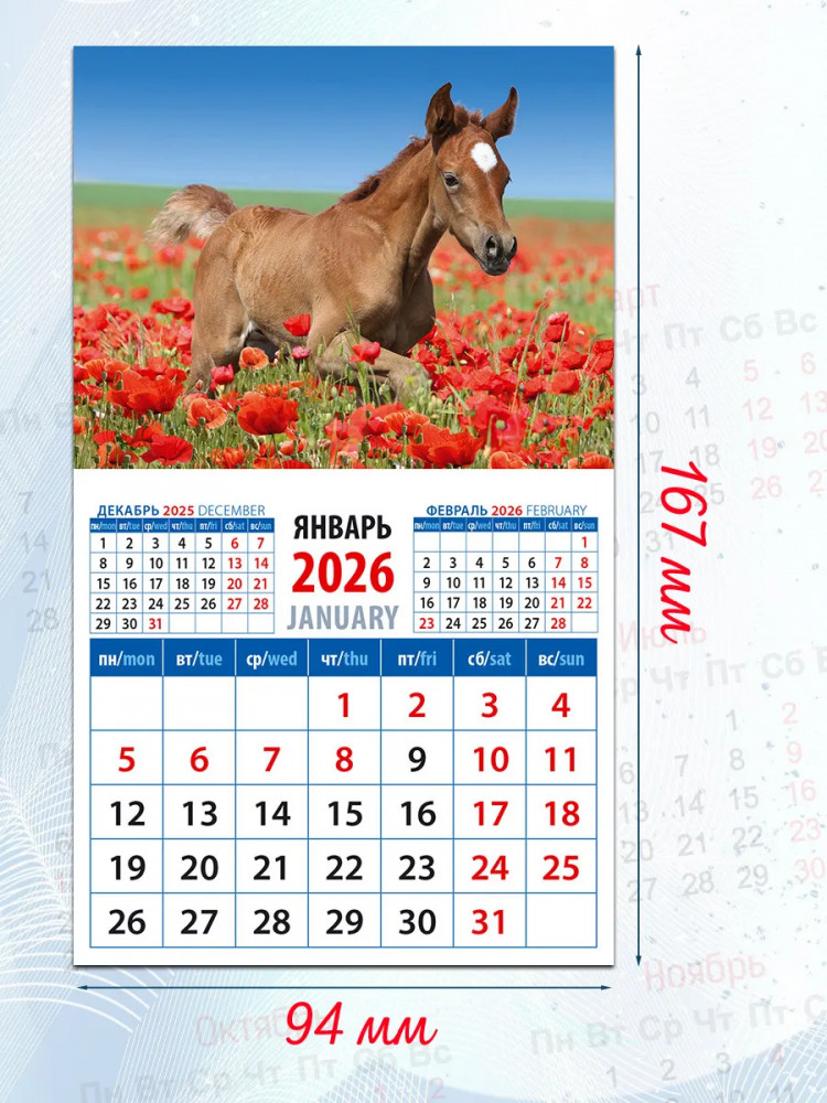 Календарь на магните на 2026 год «Год лошади. Жеребенок среди маков»В данный момент этот товар отсутствует в продаже. Возможно, у нас найдется аналогичный или похожий товар здесь. Календарь на магните на 2026 год — это компактный и практичный помощник, который легко размещается на холодильнике или любой металлической поверхности, позволяя всегда держать важные даты перед глазами. Его яркое оформление и удобный формат сочетают функциональность планирования и элемент декора, органично вписываясь в интерьер кухни или офиса. |