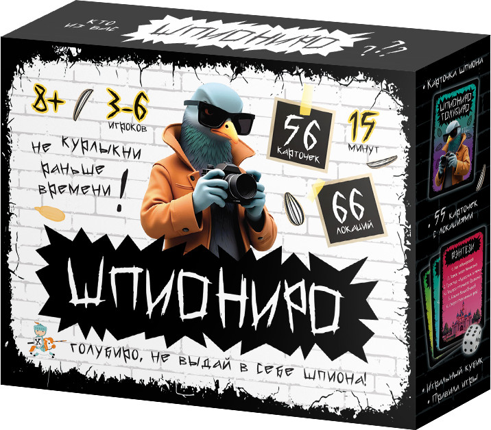 Добро пожаловать в мир «Шпиониро», где интриги плетутся под самым носом, а секреты хранятся под крылом! Эта настольная игра, в которой кубик бросает вызов, а 66 локаций таят в себе ключи к победе, превратит вас в настоящего голубиного шпиона, достойного звания лучшего среди пернатых агентов. Готовы ли вы принять вызов Шпиониро Голубиро и доказать свою смекалку?